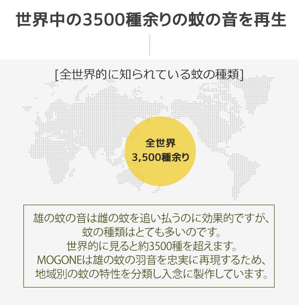 そのような蚊の習性に着目し、MOGONEは雄の蚊の羽音の周波数を正確に再現します。