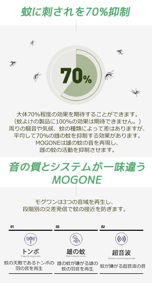 MOGONEは超音波を利用しており、周辺の騒音や気候、蚊の種類によって差はありますが、平均して70~80%の雌の蚊に対して効果を発揮します。