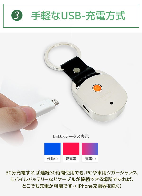 虫を嫌う方向けに、3種類の音を1Hz単位で制御して再生するデバイスです。首からかけたり、バッグやパンツにクリップするだけで簡単に取り付けできます。重さは36gで軽量設計、USBで30分充電すると30時間使用でき、携帯に最適です!