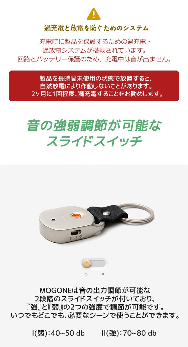 MOGONEは音で蚊を追い払うので、音が小さいほど効果範囲が狭まります。2段階の音調節機能が搭載されており、音の強弱は簡単に調節することができます。