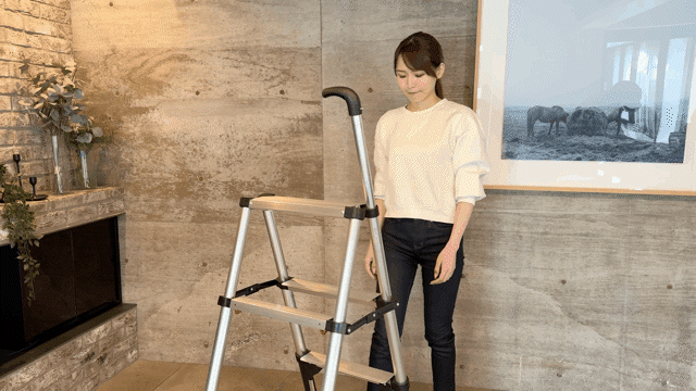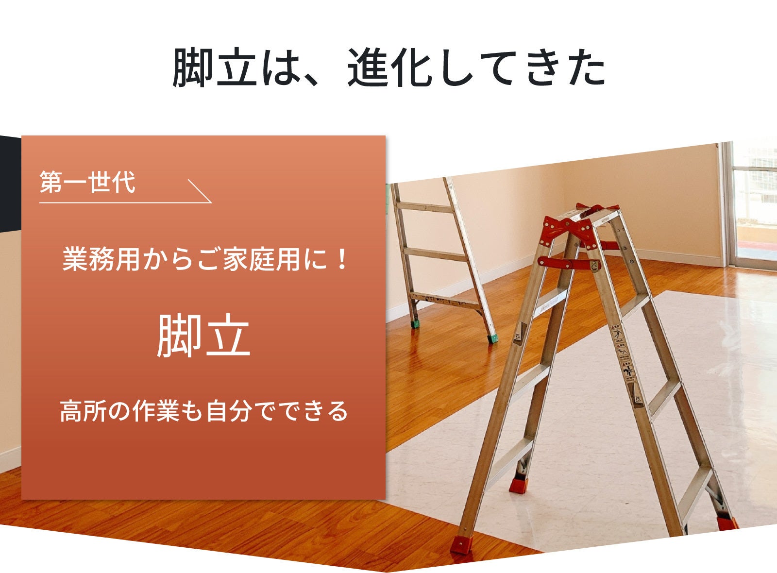 家庭で使われるようになると、業務用プラスαの使い心地(「軽さ」「収納性」など)が求められるようになり、そのニーズに応えるように脚立は進化を遂げてきました。ロック式の伸縮式脚立などは第二世代と言えるかもしれません。