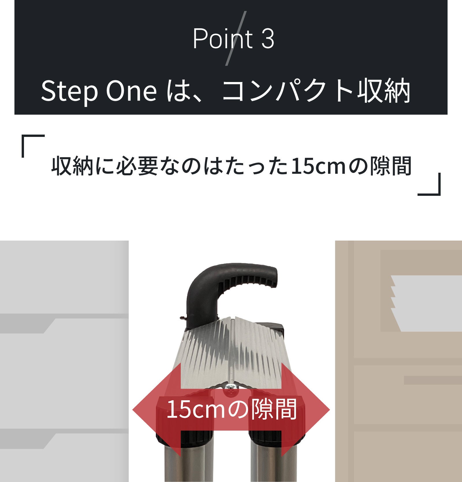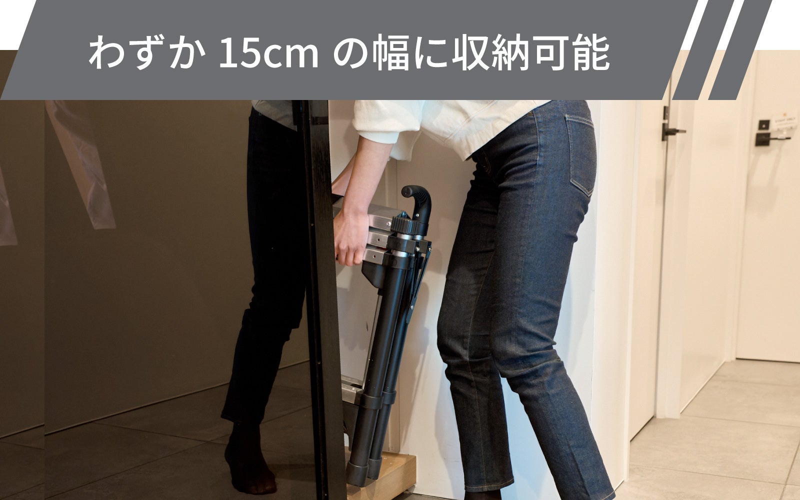 たった15cmの隙間があれば、どこにでも収納可能です。玄関や階段下収納、納戸はもちろん、オフィスにあっても邪魔になりません。