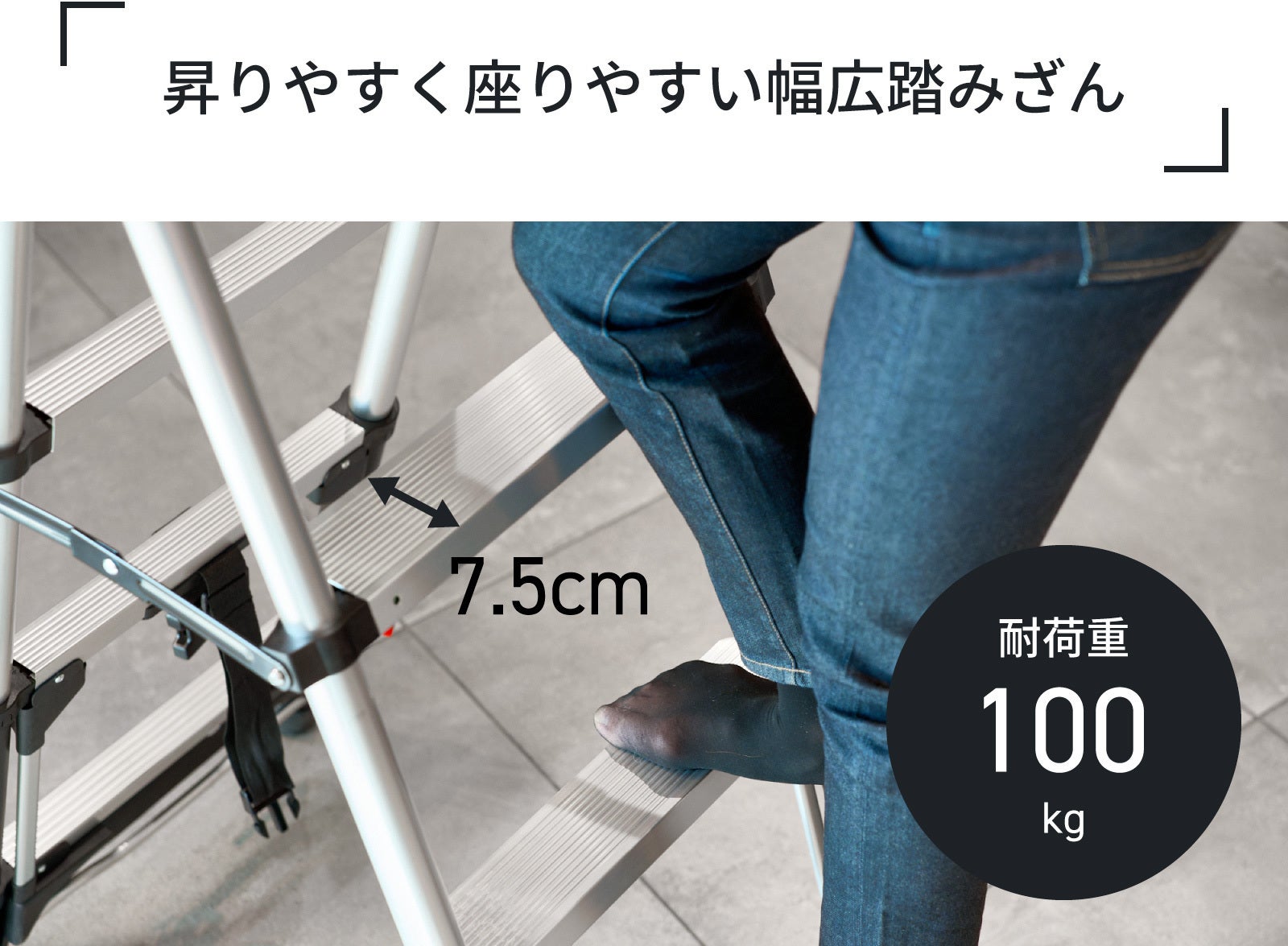 幅7.5cmのゆったりした踏みざんは昇り降りしやすく、高所での作業時に座っても安定感抜群です。(最頂部11.5cm)