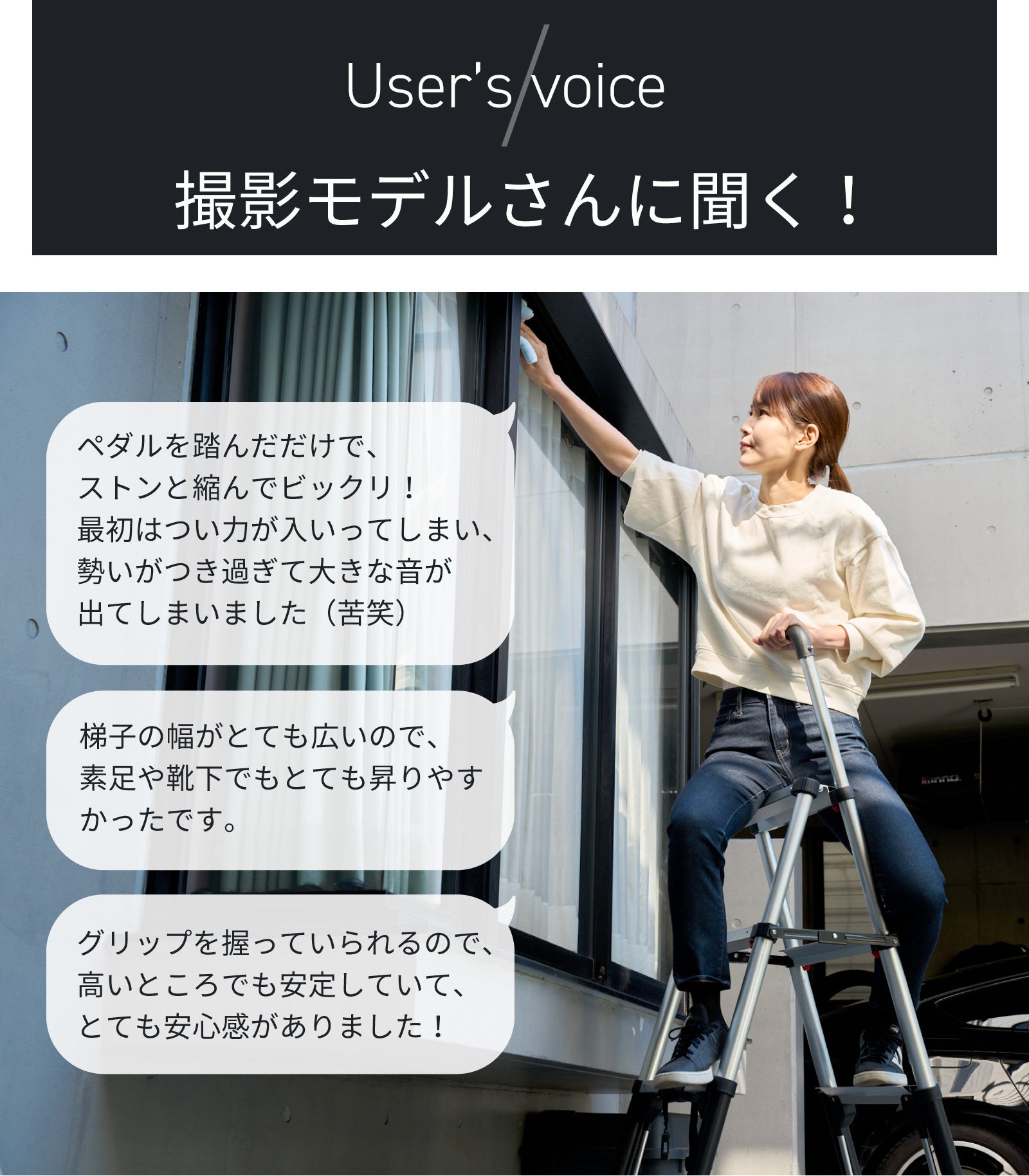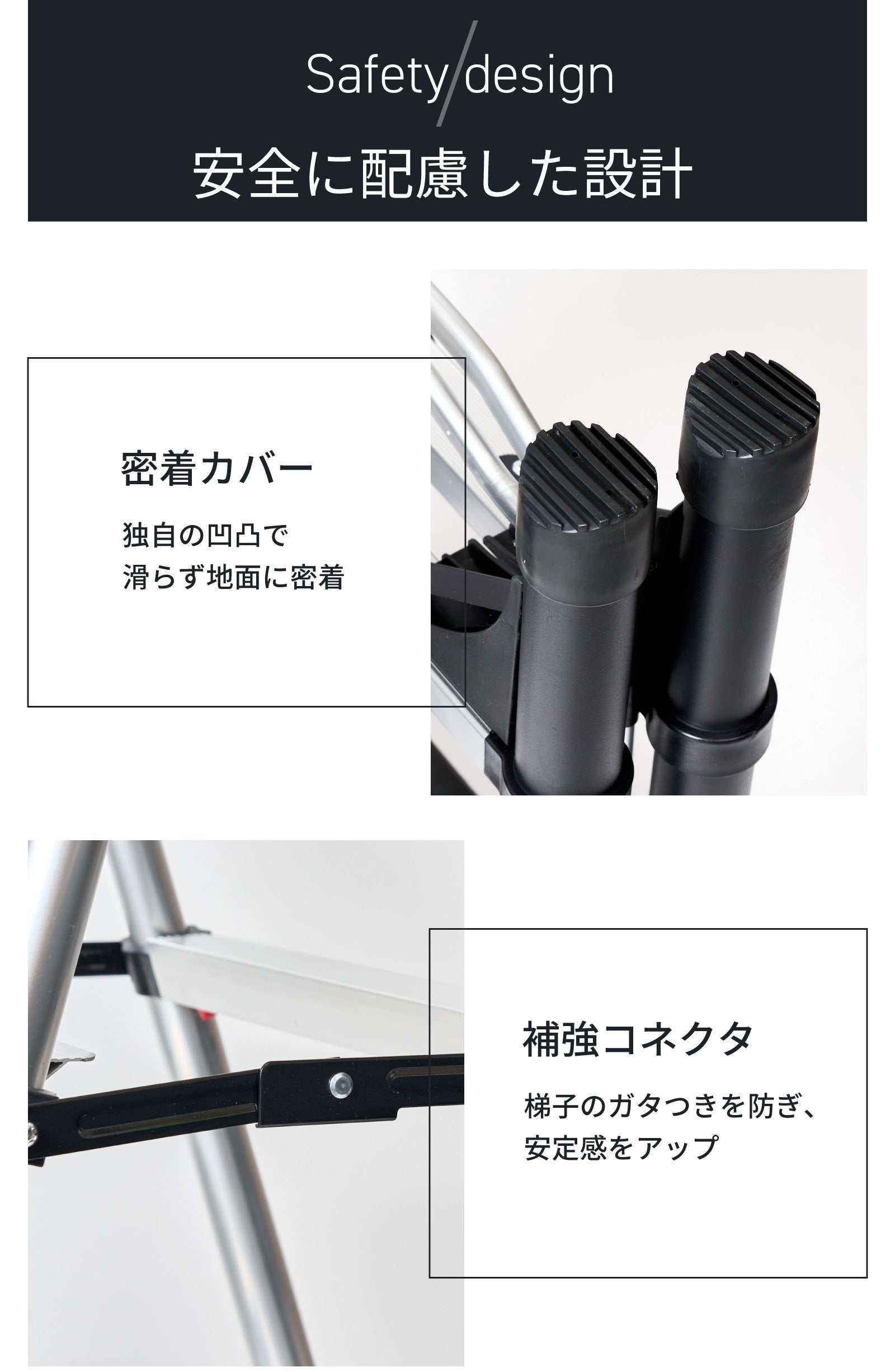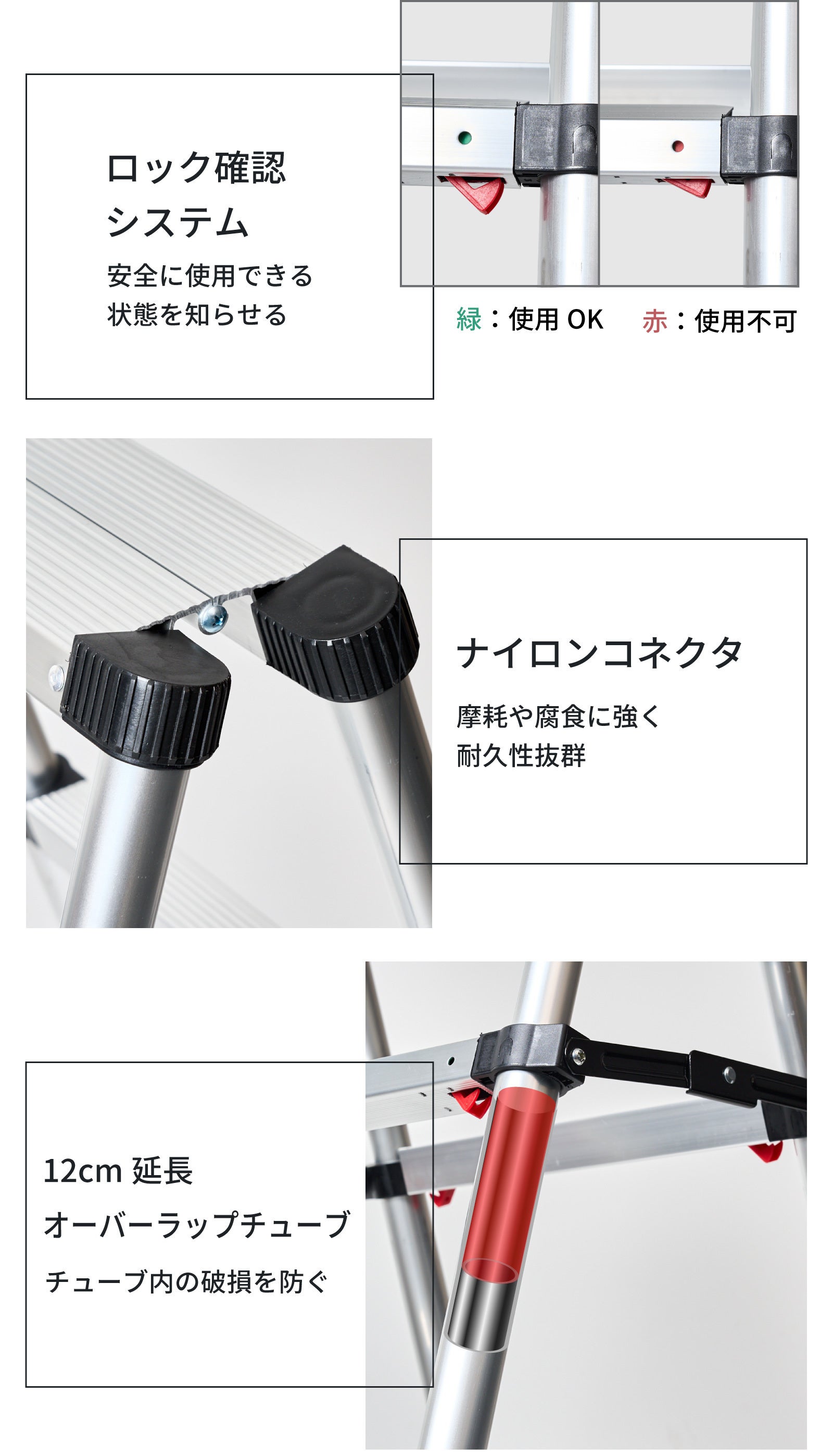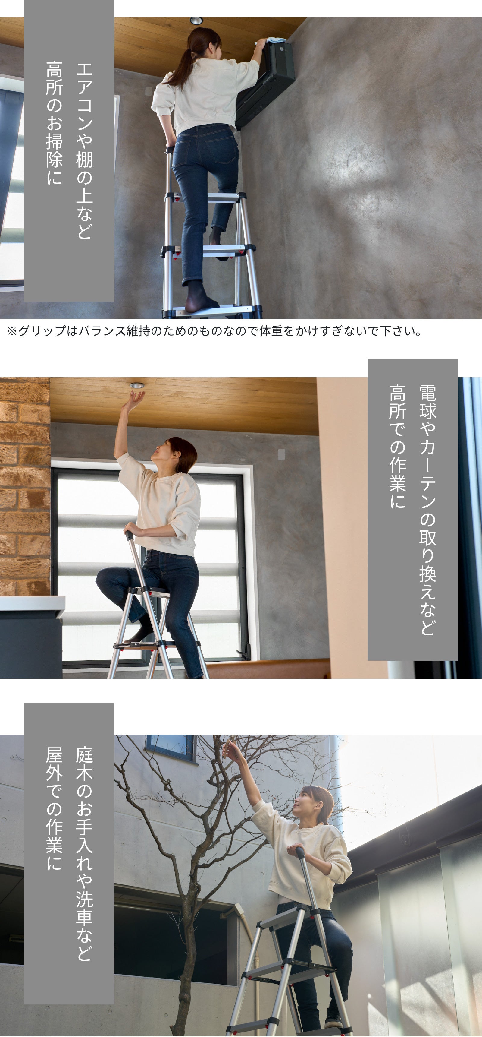 昇り降りの際や作業する時に、バランスをとることができるので、安定感の違いを体感していだたけることでしょう。