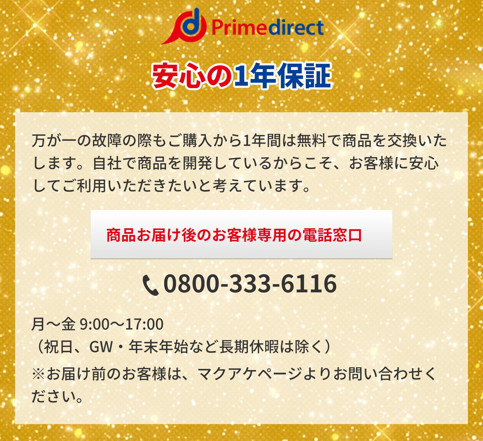 ● 事業者の連絡先 :Tel: 0800-333-6116、mail: info@primedirect.jp