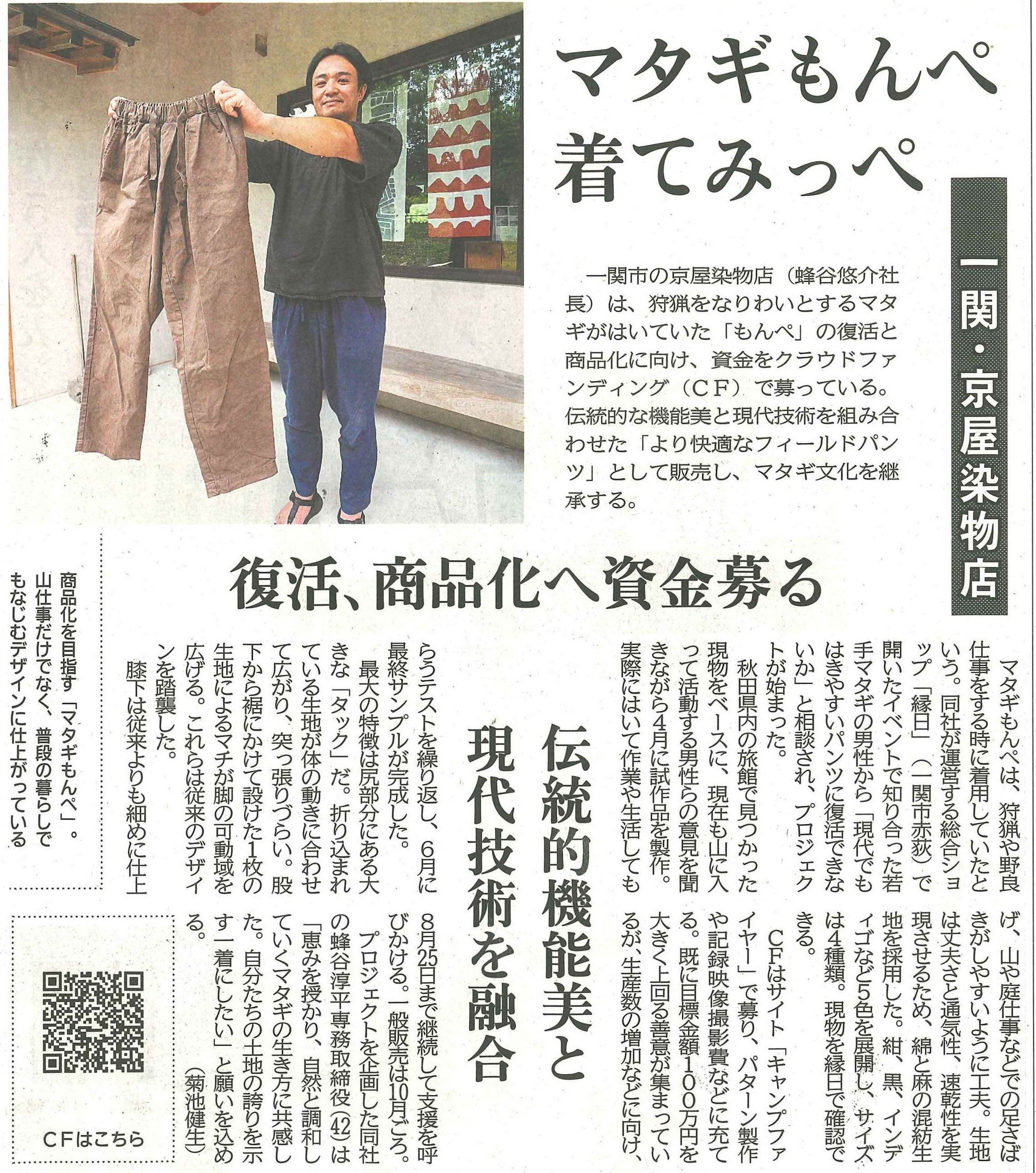 岩手日報の社会紙面の中で、「マタギもんぺ」を紹介いただきました!