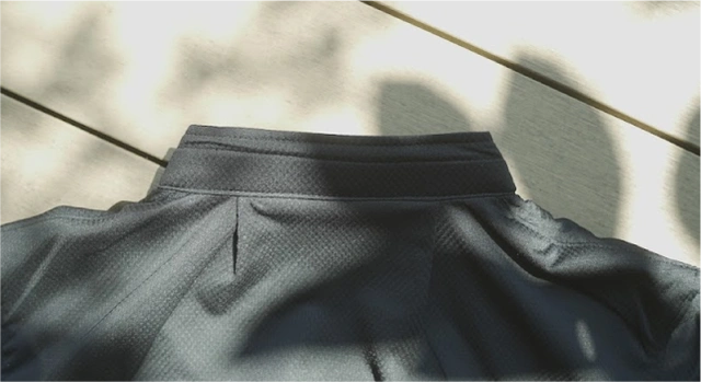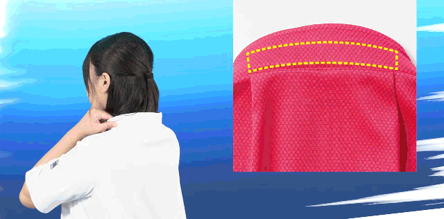 襟元には風の出口をつくるためのソフトワイヤーが入っています。空気の流れを保ち、効率よく体温を下げます。