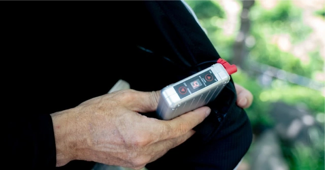 操作はバッテリー上部のボタンから簡単に変更可能です。慣れるとウェアの上からでも操作できます。