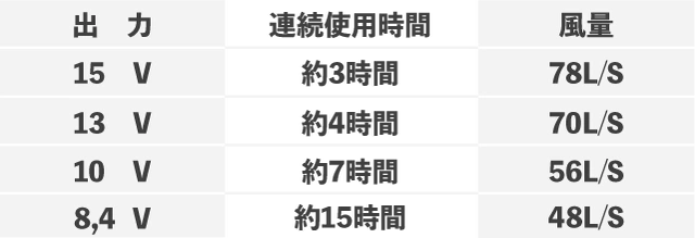 暑さによって4段階の風量に切り替え可能です。最大約15時間連続使用可能。バッテリー残量を気にせず、1日中涼しく過ごしましょう!