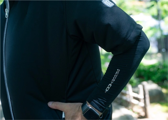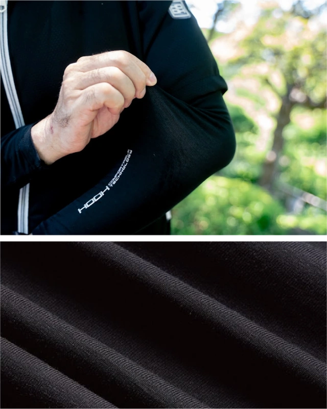 風を逃がさない高密度ニットは、チタン配合の冷感生地を使用しています。柔らかい着心地で動きやすく、屋外でも屋内でも快適に過ごすことができます。