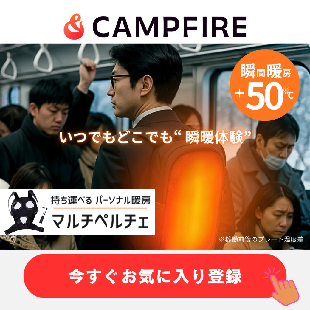 2025/11/30 20:00新プロジェクト『マルチペルチェ』が、いよいよ12月2日 8:00〜スタートします!背中からあたたまる “持ち歩ける暖房”。極寒の通勤も、朝の冷え込みも、スイッチひとつでじんわりポカポカ。冷暖切り替えで夏も使えます。公開直後だけの《超早割》は数量限定!確実に受け取るために、今すぐ「お気に入り登録」お願いします。https://camp-fire.jp/projects/889198/view寒さが本格化する前に、お得に“あったか準備”していきましょう。ご注文後は 3〜4日以内に即発送します! もっと見る