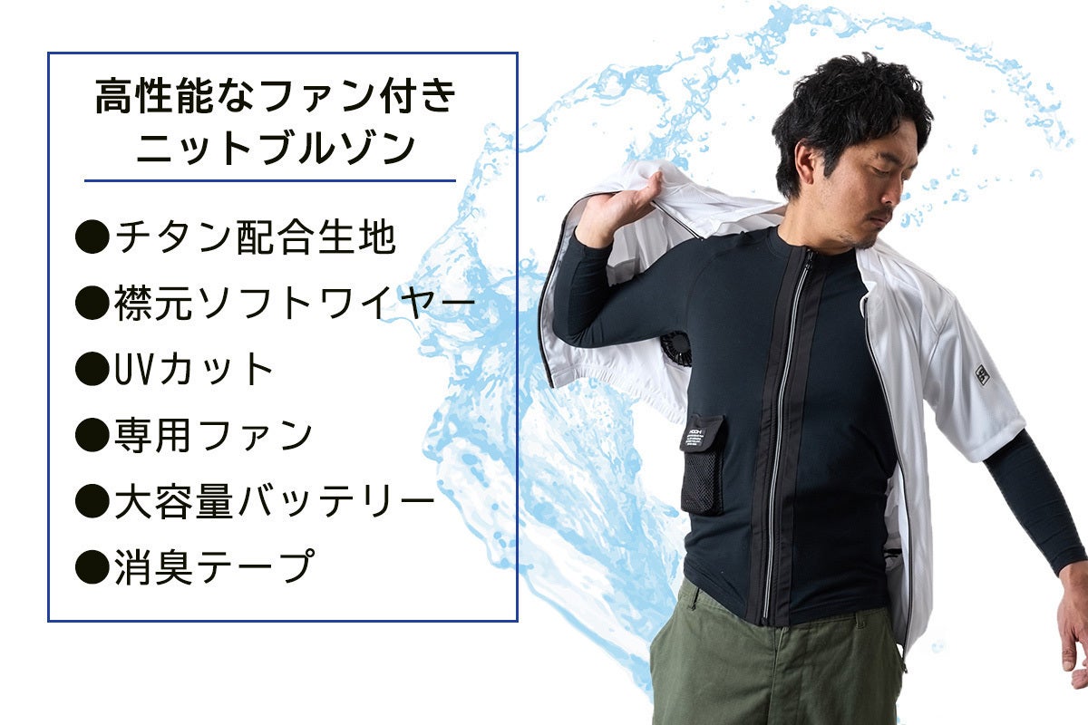 カジュアルなファン付きニットブルゾン!軽量なバッテリーは最長約15時間の連続使用可能!快適な着心地と動きやすさを追求し、体温上昇を抑えるクーリング効果の高いニット素材。