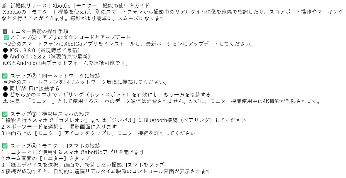 2025/04/23 16:28みなさま、ご無沙汰しております。XbotGoに待望の機能が追加されました♪ 多くの方々からご要望ありました、 「撮影している画面を確認したい」というお悩みを解決する機能です。XbotGoで使っているスマートフォン以外に、もう1台スマートフォンをご用意頂ければ、そちらでモニターすることが可能です。 さらに、リモコン操作も画面上で行えるので、手元で画面を見ながら撮影角度を変えることも可能になりました! 詳細は画像にて記載させて頂いております。これまでよりも、大きく撮影体験が変わると思います。 今後とも、XbotGoで楽しい撮影をお楽しみください。ご不明な点等ございましたら、LINEにご連絡頂けますよう、宜しくお願い致します。https://lin.ee/D1YMut73 もっと見る