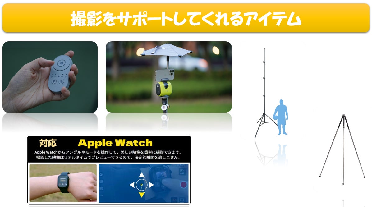 皆様、こんばんは!XbotGoの撮影を更に便利に、更に素敵な動画撮影をサポートしてくれる、アイテムたちを紹介させて頂きます。①リモコン(XbotGo2には同梱されております)こんなシチュエーションで活躍してくれます。↓・三脚にXbotGo2を取り付けて、高く伸ばした状態で操作したい時・XbotGo2は観客席や2階席に置いて撮影、操作する人はフィールドにいる時・動画撮影開始/終了、写真撮影、自動編集のマーキングなどボタンをワンプッシュで操作(※10メートルまで遠隔操作可能です)②三脚取り付け傘こんなシチュエーションで活躍してくれます。↓・真夏で直射日光が強い、暑い日の日除け用で(※スマートフォンが高温になると、撮影がストップすることがございます)・雨が降っているけど、撮影したい時(※スマートフォンもXbotGo2も強い雨に当たると、故障の原因となります)③メーカーオリジナル三脚(高さ4メートル)こんなシチュエーションで活躍してくれます。↓・いつもと違う目線で(高い画角から)撮影したい時・大人のサッカーやラグビーなど、広いフィールドを撮影したい時④メーカーオリジナル三脚(高さ1メートル)こんなシチュエーションで活躍してくれます。↓・人の目線に近い画角で撮影したい時・軽量でコンパクトなので、さっと持ち運んで撮影したい時⑤【※別売です】Apple Watchこんなシチュエーションで活躍してくれます。↓・リモコンの代わりに、XbotGo2を操作したい時・手元でXbotGo2の撮影画面を見ながら操作したい時