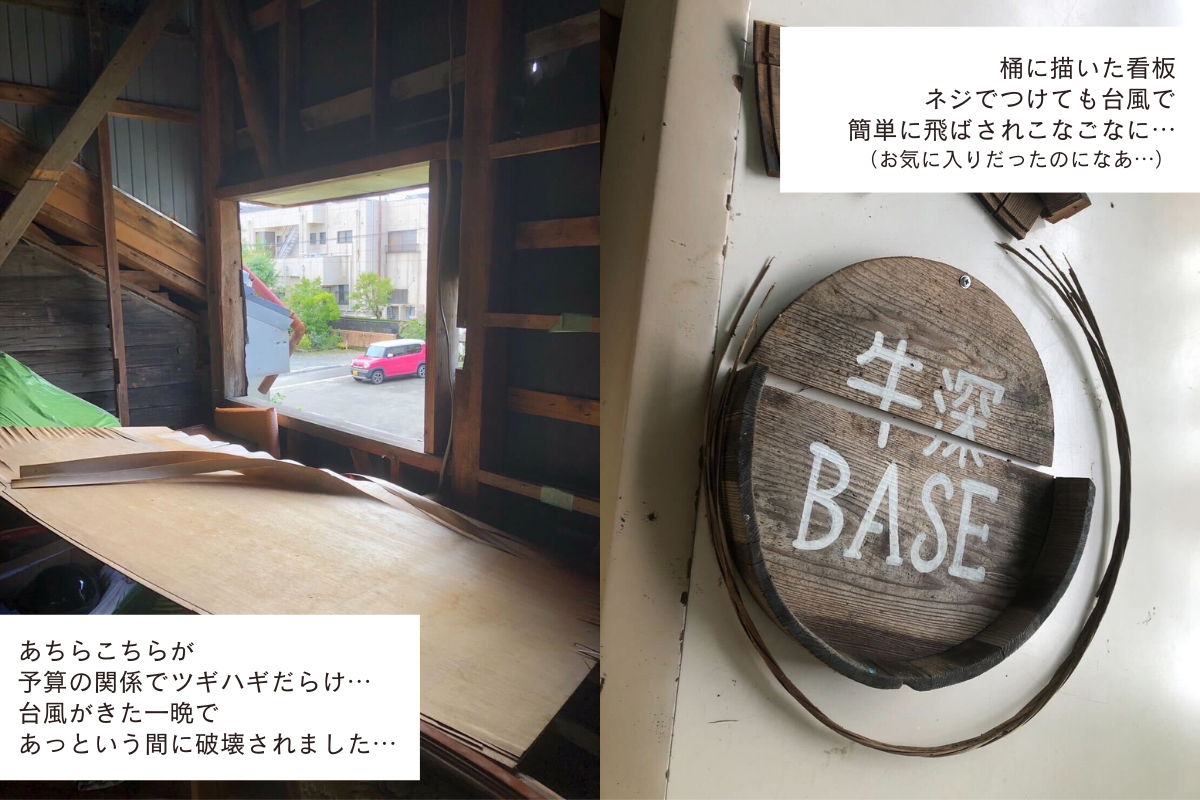 加えて牛深の夏は激しい台風もきます。海の恩恵を受けられるからこそ、この洗礼は避けられません。これからもっといろんな人のシェアキッチン利用を高めていきたいし、もっといろんな人達が遊びにこれるような場所にしたい。そしてたくさんの人と育ててきたこの場所を守りたい。そのためにも、空調と台風対策は必須だ。と決意したのでした。