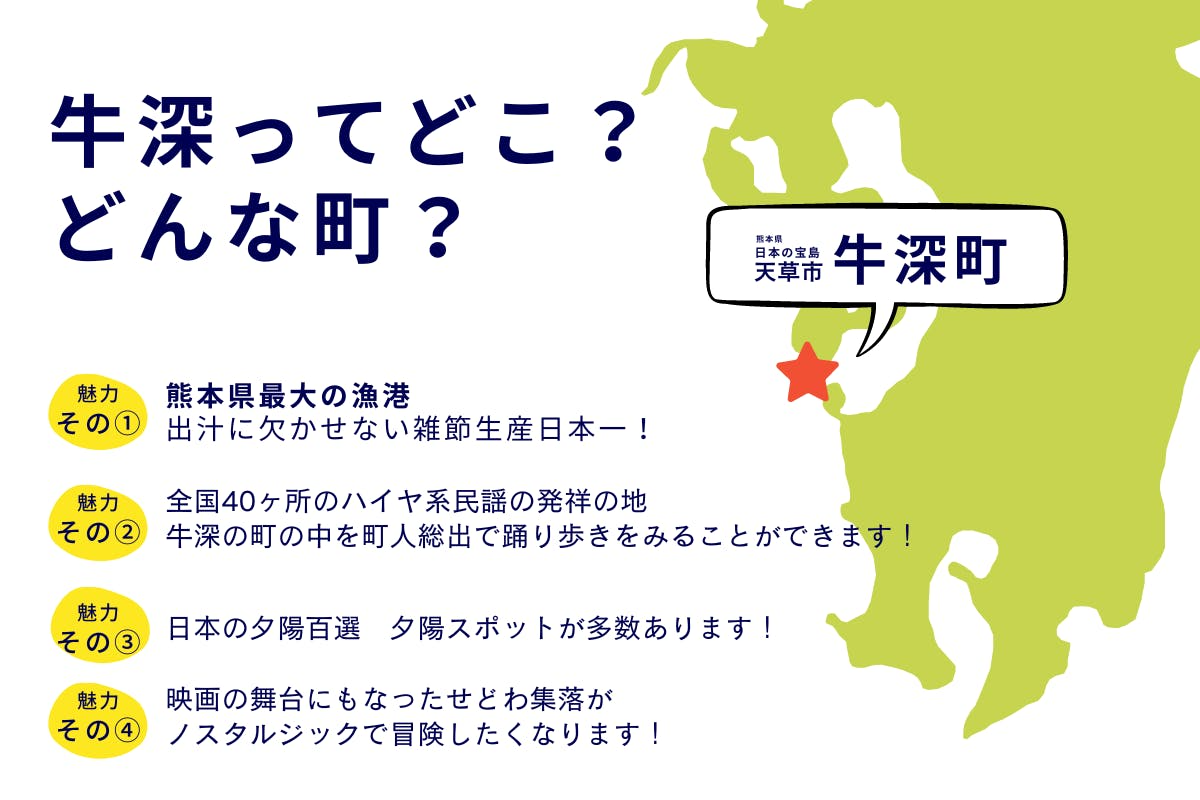 水産資源の減少、後継者不足などにより低迷した状態が続き、空き家の増加、人口の減少、少子高齢化と様々な課題を抱えています。牛深に訪れる人も年々減ってきて、さみしくなってきた。と町の人たちは話します。たしかに牛深町は、熊本空港から車で3時間半、最寄りの駅まで1時間半・・・。熊本の端の端の方。訪れるにはハードルの高い場所です。