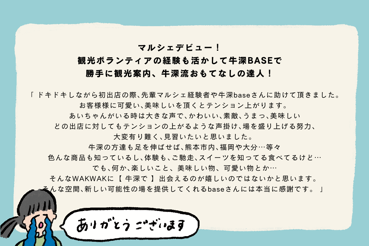 わたしにとって、自分の家のリビングのような場所です。共働きで鍵っ子だった私は、今牛深じもと食堂で沢山の人に「おかえり」を言ったり、言ってもらったりしています。自分の成長を聞いてもらったり、人の夢を聞いたり、一緒に叶えたり。困ったことを相談したり、人と人が力を合わせて困難を乗り越えていたり。町にリビングがあることの「オモシロさ」をたくさんの人に知ってもらえたらなと思います。