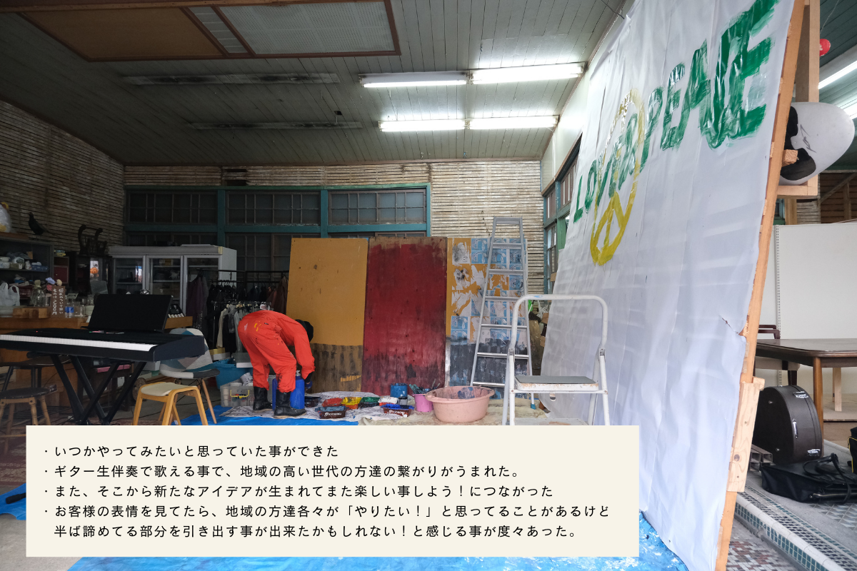 食堂を1年営業していると、地元の人が小さいことから大きいことまで、夢を語ってくれるようになります。その会話の中ででてきた、「マルシェにでてみたい」「スナックをやってみたい」と語ってくれた夢を「空き家を使って叶えられないかな?」と会話を重ねて、シェアキッチン、レンタルスペースを使って、地域の人の夢をサポートし、チャレンジをしてきました。