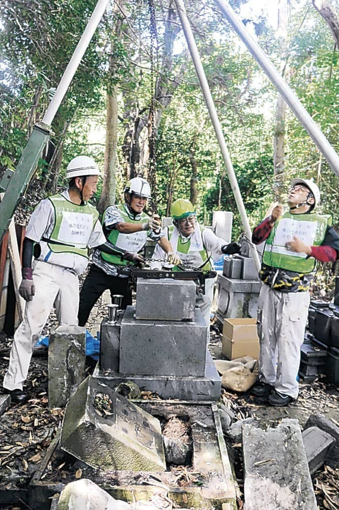 山の寺寺院群の日蓮宗實相寺(じっそうじ)では、地元の石材業者含め、日本石材産業協会や全国優良石材店の会などに所属する全国の職人が墓石の仮復旧の支援に入りました。