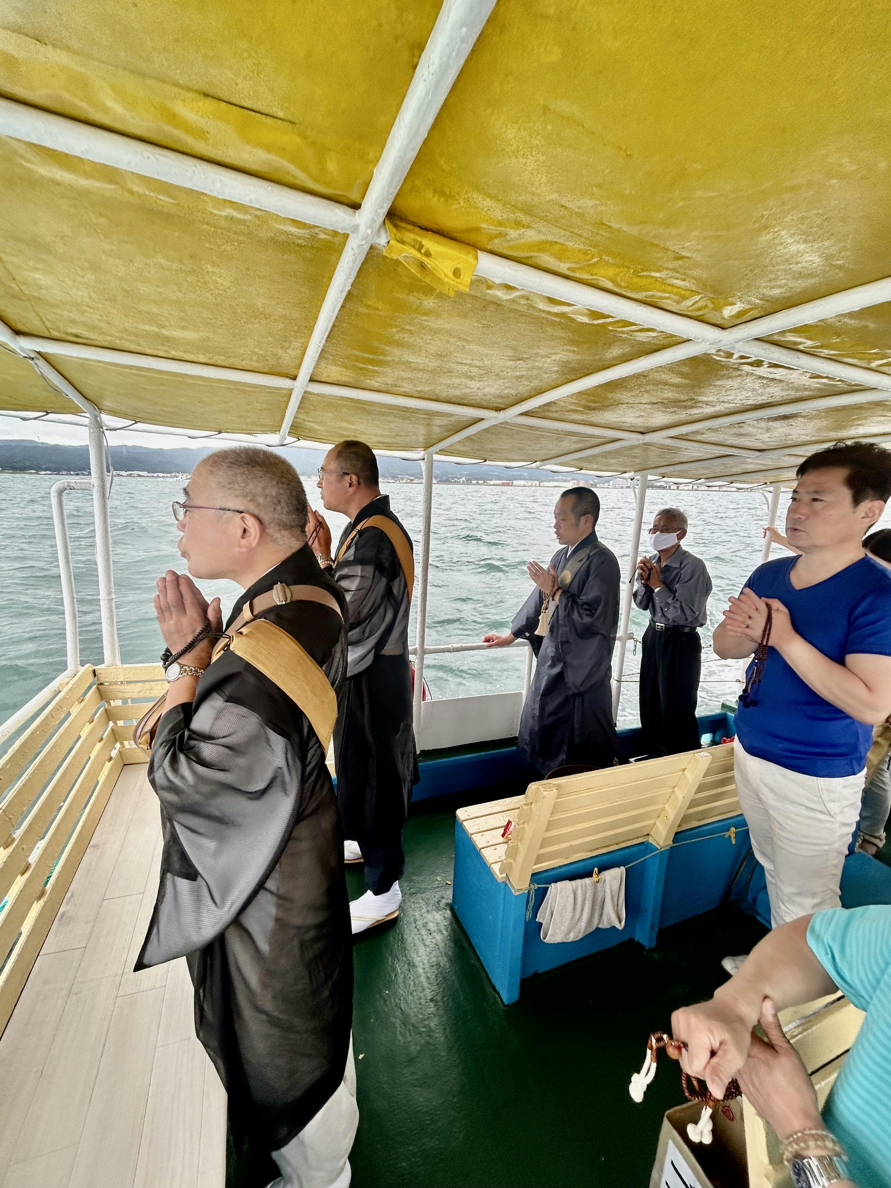毎年お盆時期に行われている行事で 山の寺寺院群の日蓮宗6ヶ寺の住職と檀家さんが 法要をお寺で済ませた後、七尾の港から船に乗り、海上でお祈りと共にお札を流すという行事です。