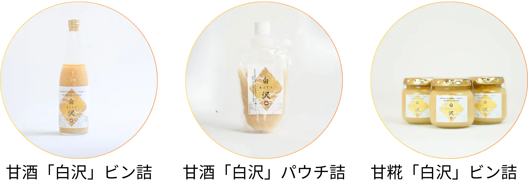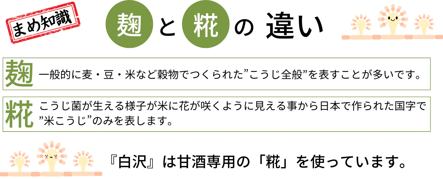 甘酒『白沢』と甘糀『白沢』は、丹精込めて育てたコシヒカリの一等米と水と甘酒専用の麹「白麴雪こまち」 だけで作っている、自然な味わいの甘酒と甘糀です。