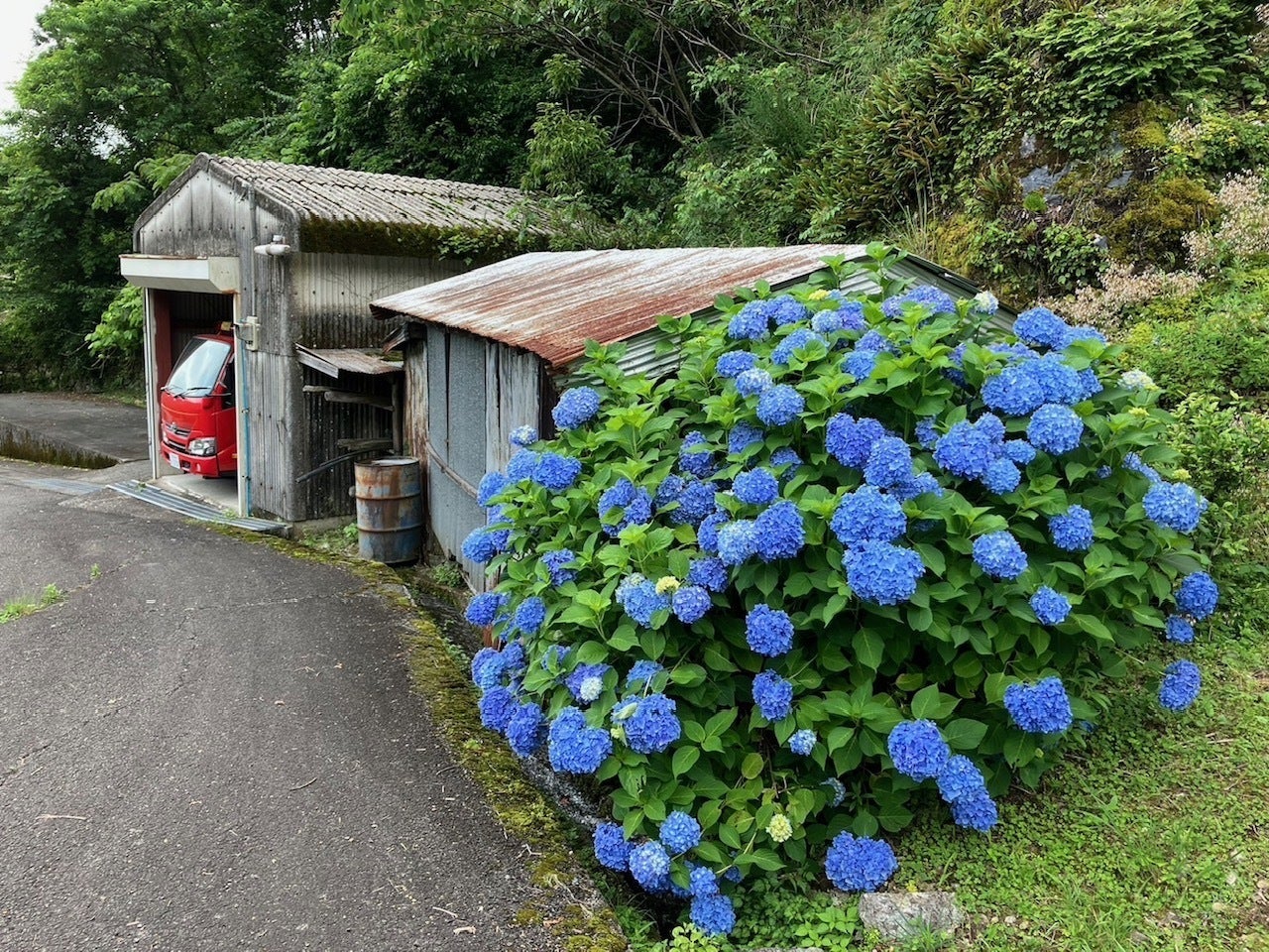 ゆずの里山、村の人以外はだれーも見に来ないけど紫陽花がとても綺麗に咲いています。赤い消防車がかわいいですね。限界集落と呼ばれていますが、いつまでもゆず畑と共に残ってほしい景色です。皆様の応援が、農家さんの力になると思います。ありがとうございます。