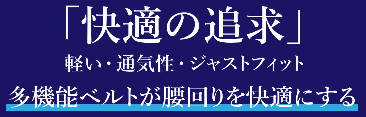 特許仕様のロインコントロール(特許登録番号:4562121号)が腰回りを快適にします!ベルトの裏に吸放湿性のある3Dメッシュを使用し、ベルト表面のパンチングデザインの空気孔より腰回りの嫌なムレを放出しムレを軽減できる通気の良い快適仕様。