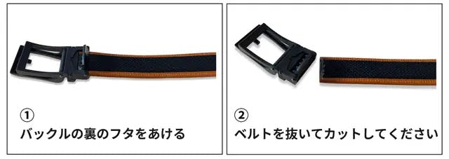バックル裏のフタをあけてベルトを抜いてください。抜いたベルトをお好み長さでハサミなどでカットしてください。ベルトはカットしてしまうと長さは戻せないのでご注意ください。