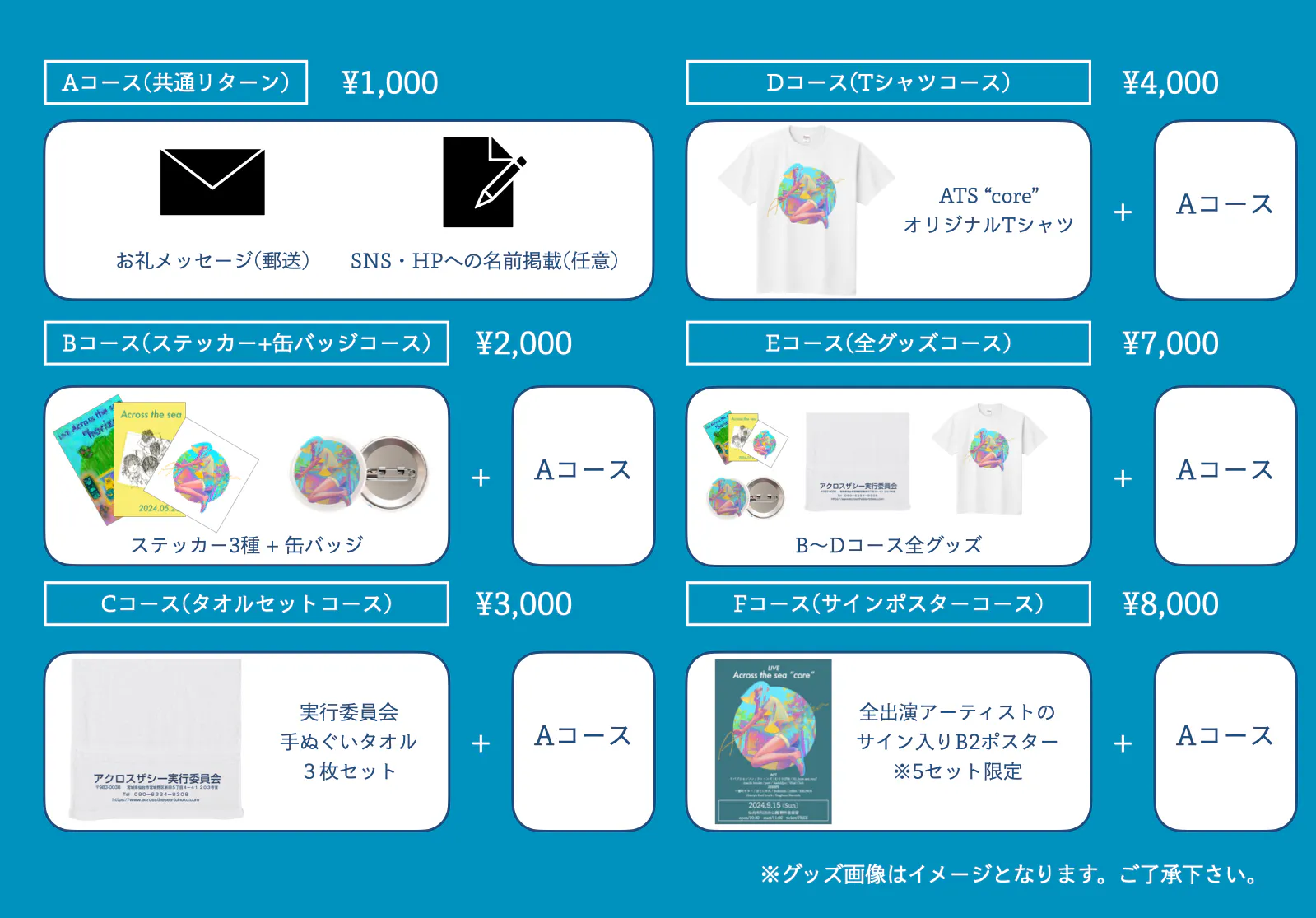ご支援をいただいた方にはお礼の品としてAcross the seaのグッズを贈らせていただきます。