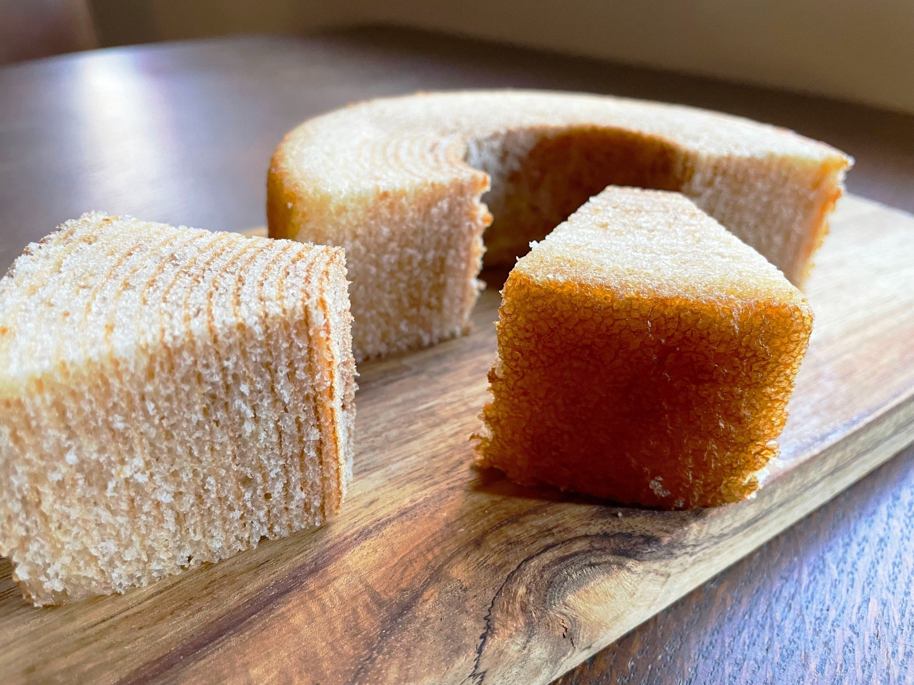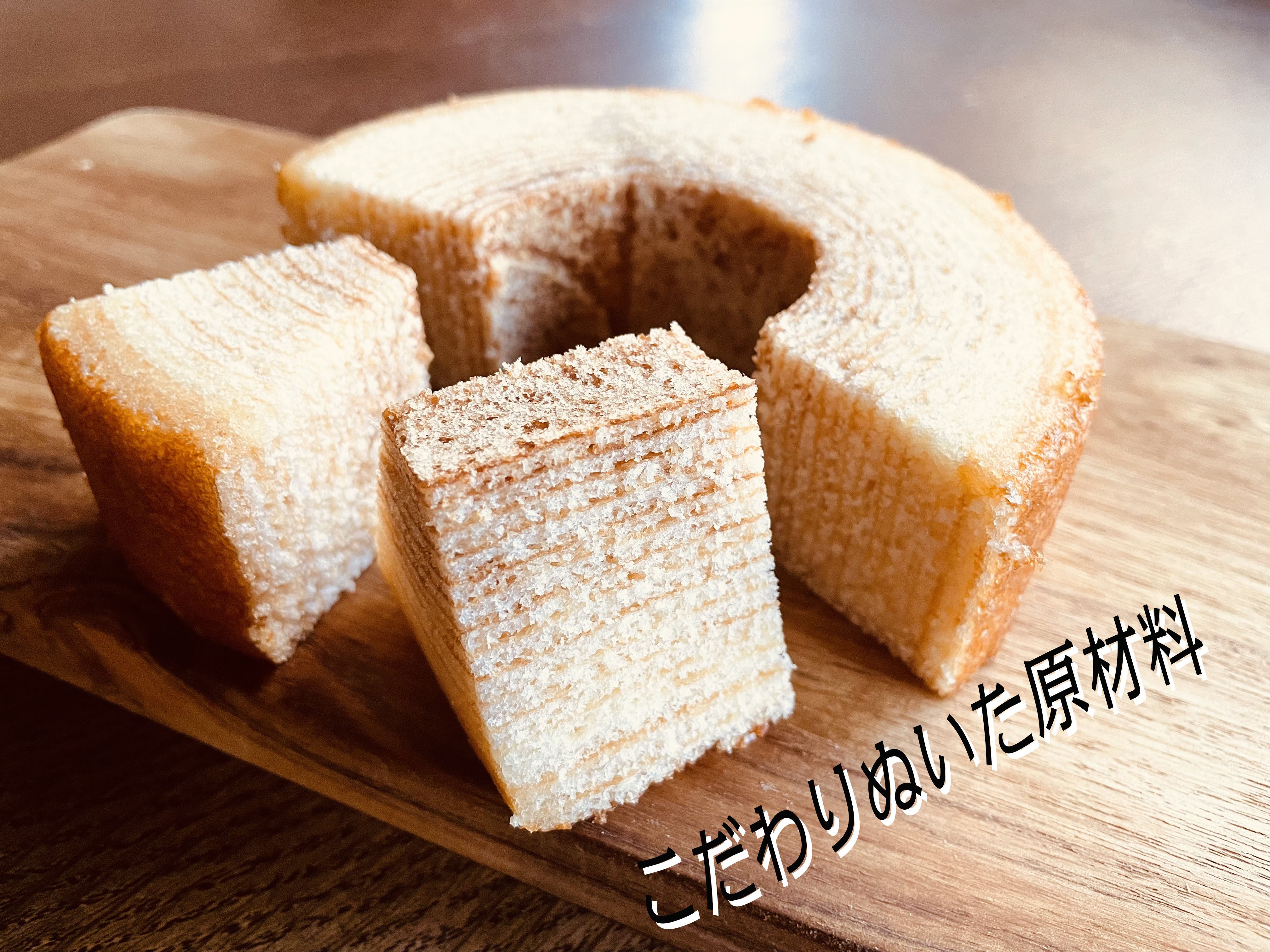 こだわりのレシピと製法で作り上げられたバームクーヘンは しっとりふんわり の質感に