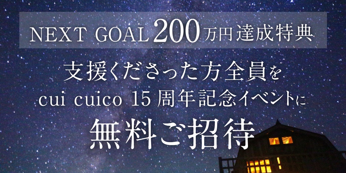 事前の告知通り、NEXTゴール200万円に達したため、【cui cuico 15周年のイベントに支援者全員を無料ご招待】いたします。