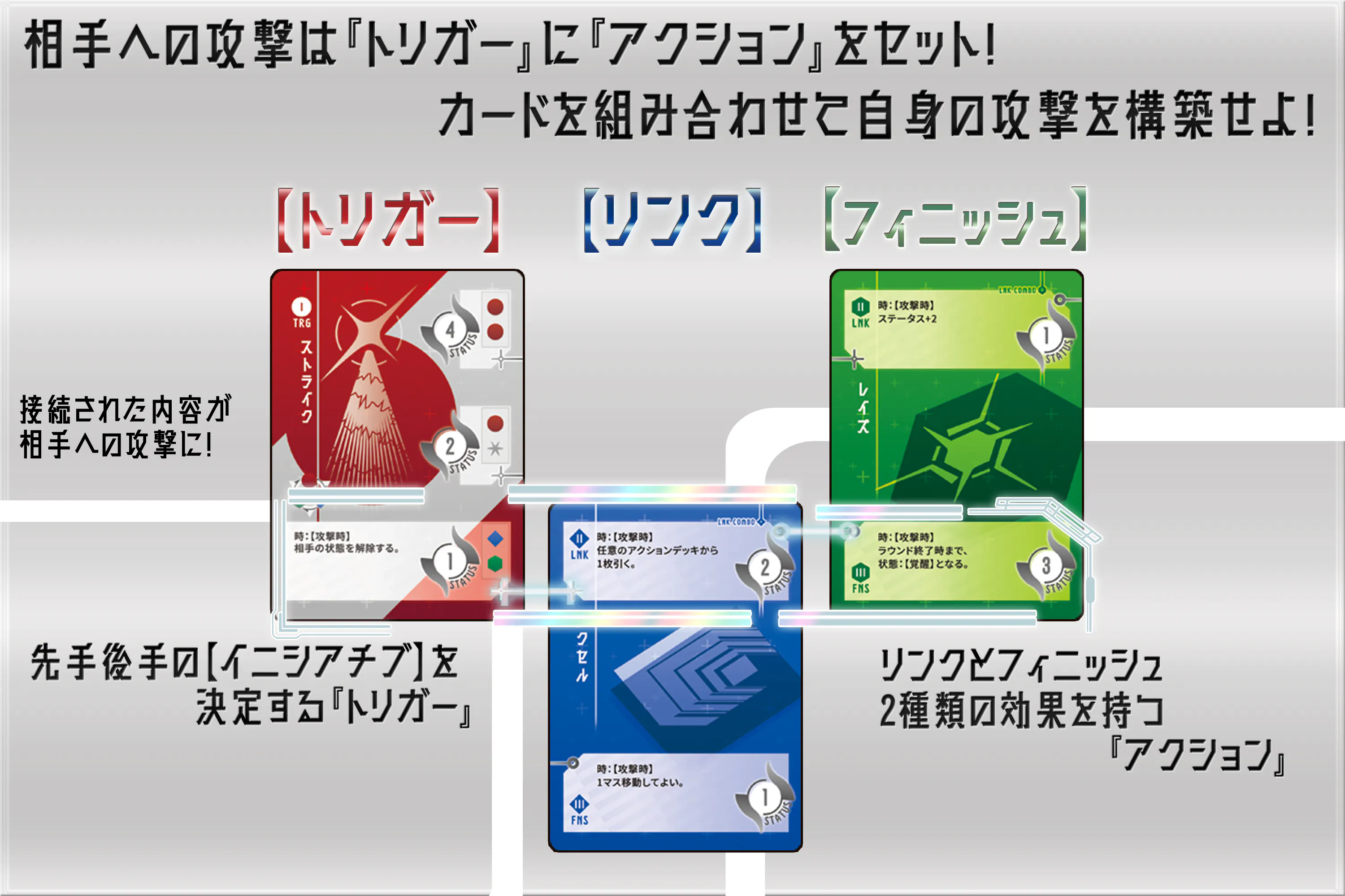 ゲームシステムは『3×3の盤面』を巡り、『3種の攻撃用のカードを組み合わせて攻撃し合う』、『プレイヤー個人のターンが存在しない』対戦ゲームとなっております。