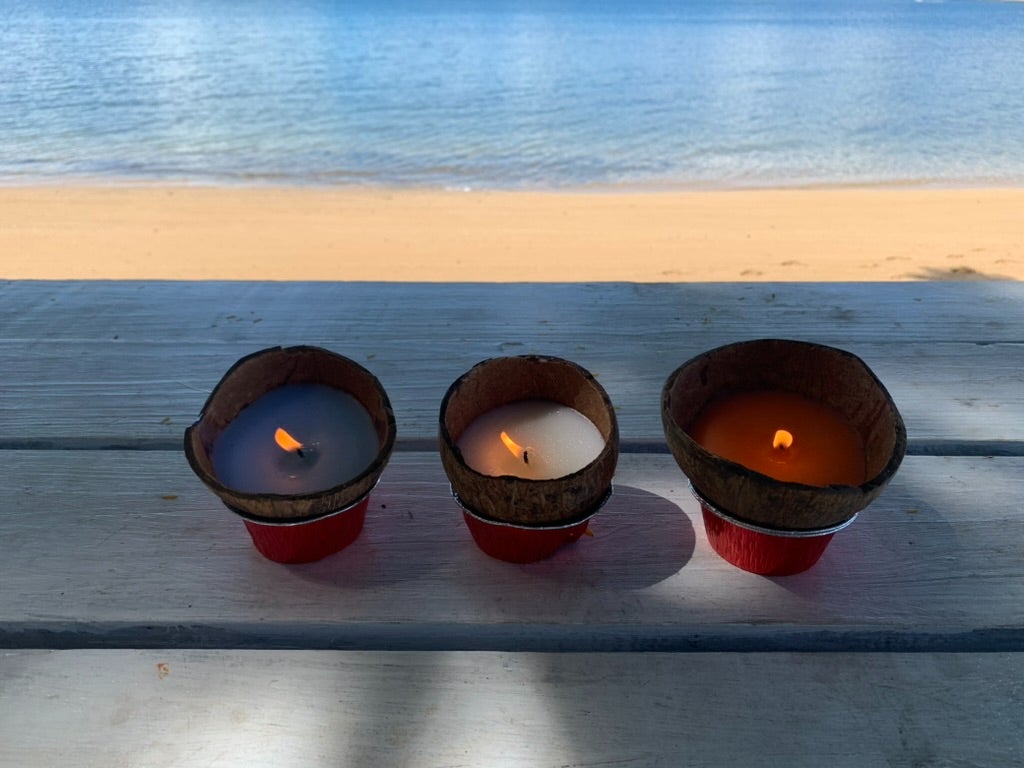 このキャンドルは、捨てられるはずだったココナッツを使用した、環境に優しいキャンドルです。フィジーでは、見た目はほぼ同じでも、ココナッツウォーターが入っていないと捨ててしまいます。なぜなら、人々はそれに含まれる栄養価を重要視しているからです。このような理由で捨てられてしまうものがかなり多いため、逆にこれを活用しようと考えました。