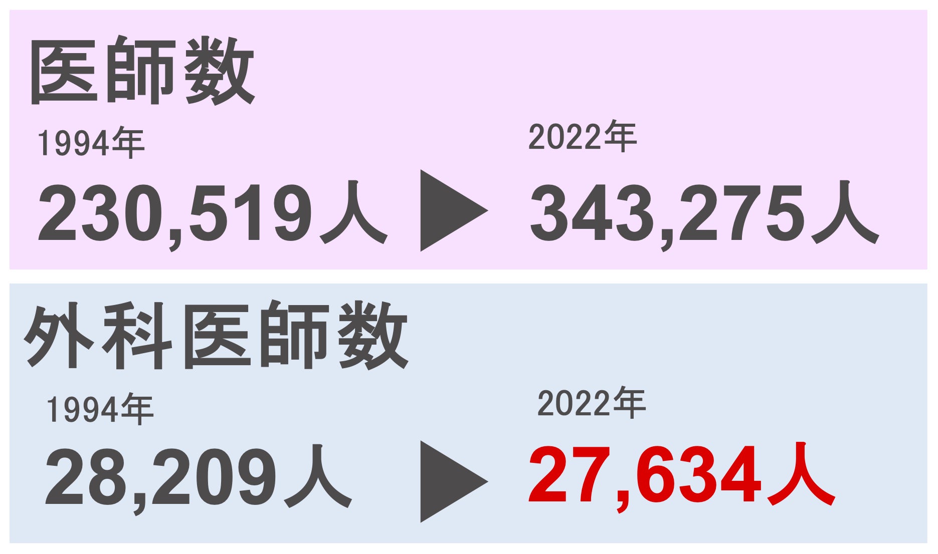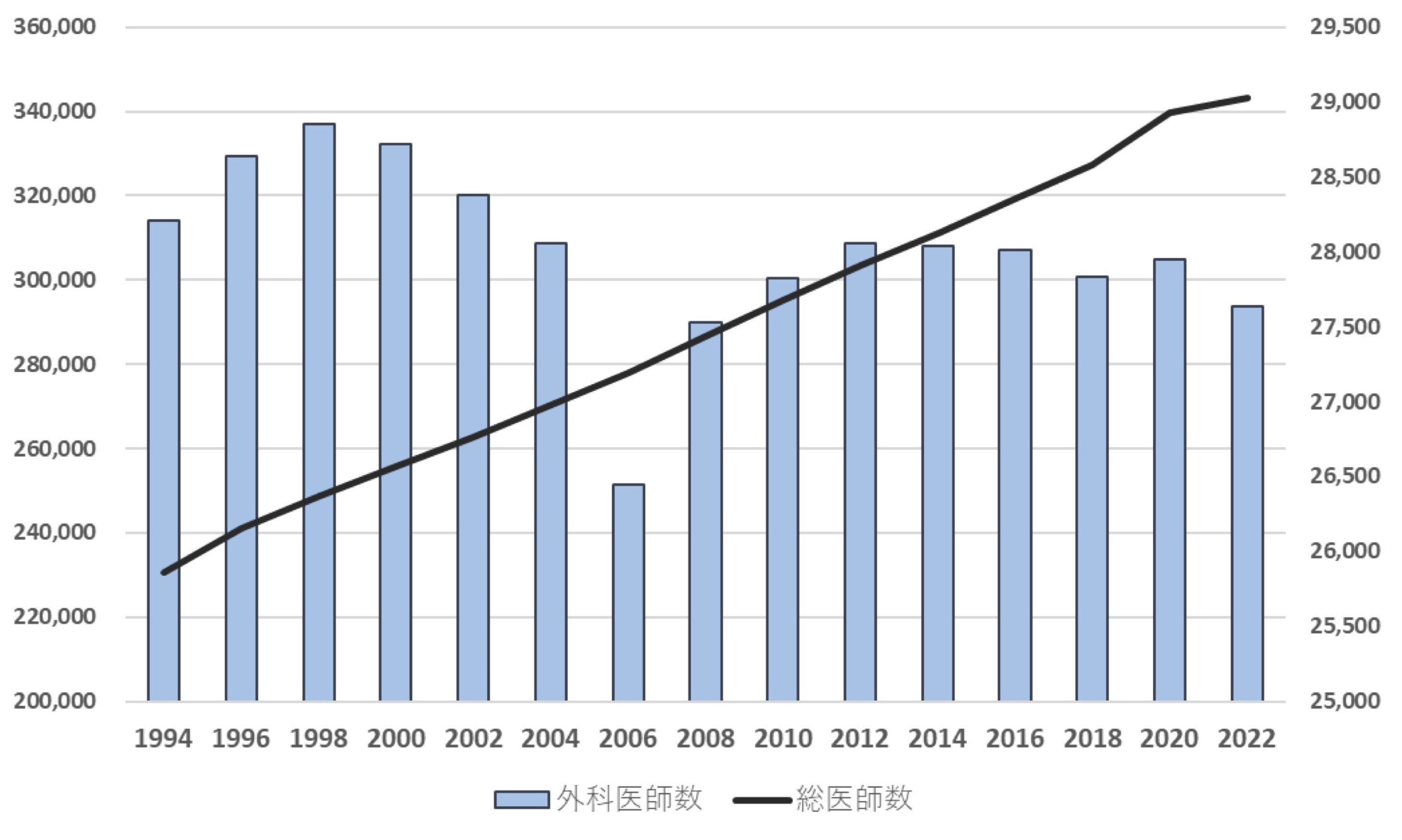 がん診療や救急医療を担う外科医師数は減少の一途を辿っています.日本の医師数は医学部定員増もあり1994年230,519人から2022年343,275人と26年間で約11万人増加しましたが、外科医師数は1994年の28,209人から2022年は27,634人と減少しています.栃木県内の病院に常勤している外科医師数も2018年373人から2021年353人と減少しています.