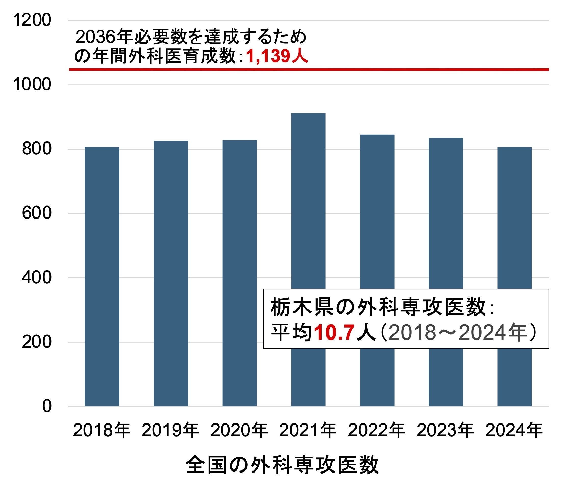 また、2036年の診療を担う外科医師を確保するには年間1,139人を養成する必要があると試算されています.しかしながら、2018〜2024年までの7年間、外科専攻医(外科専門医を目指す医師)は年平均837.3人で、必要な外科専攻医の73%にとどまっています.栃木県でも若手外科医師不足は例外ではなく、栃木県の外科医療を維持するためには毎年16〜23人を養成する必要があると試算されていますが、最近7年間の外科専攻医は年平均10.7人に留まっています.