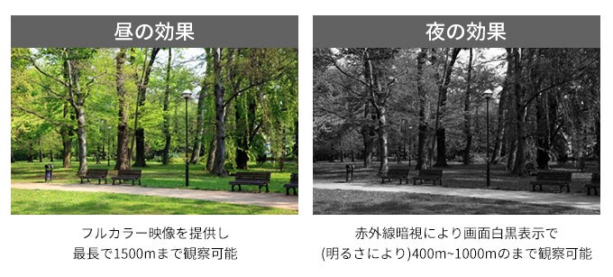 最大1000メートルの暗視距離により、遠くの対象物をはっきりと観察できます。広大なフィールドや遠方の景色を詳細に確認できるため、アウトドア活動や自然観察に最適です。