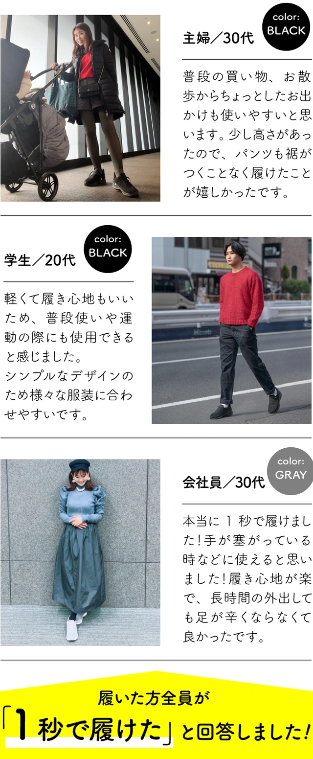 A : 本当に1秒で履けます。商品展示会にて10名以上のお客様にラクーンをご体験いただき実証済みです。