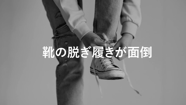 そんな悩みは『LAQUN(ラクーン)』で全て解決!立ったまま足を入れるだけで素早く履けて、もう出かける前に急いで靴紐を結ぶことはありません。