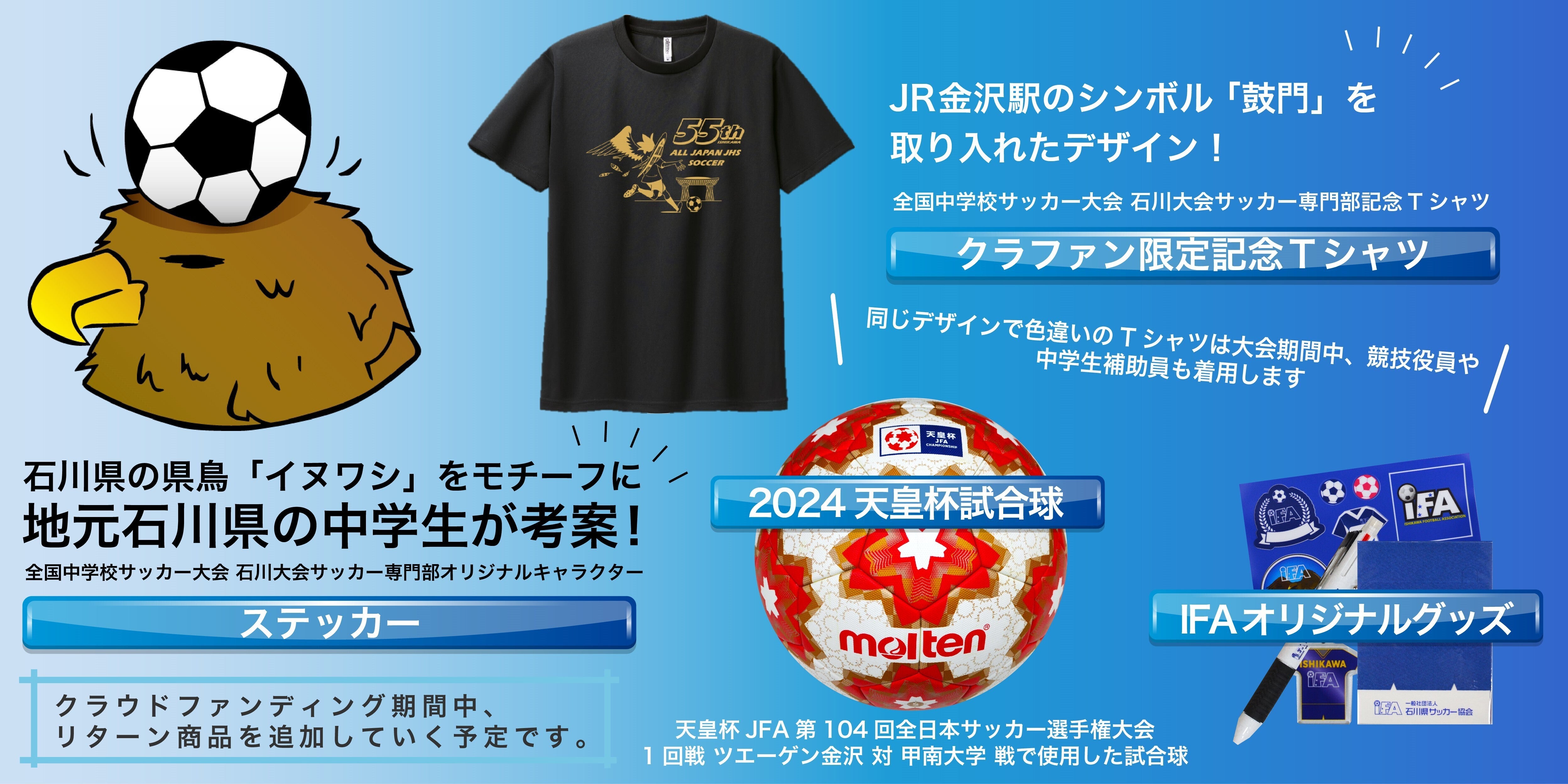 地元石川県の中学生が考案した、全国中学校サッカー大会石川大会サッカー専門部のオリジナルキャラクターのステッカーと石川県サッカー協会(IFA)のオリジナルグッズ、クラファン限定記念Tシャツのセットなどを用意いたしました。2024天皇杯試合球もあります。