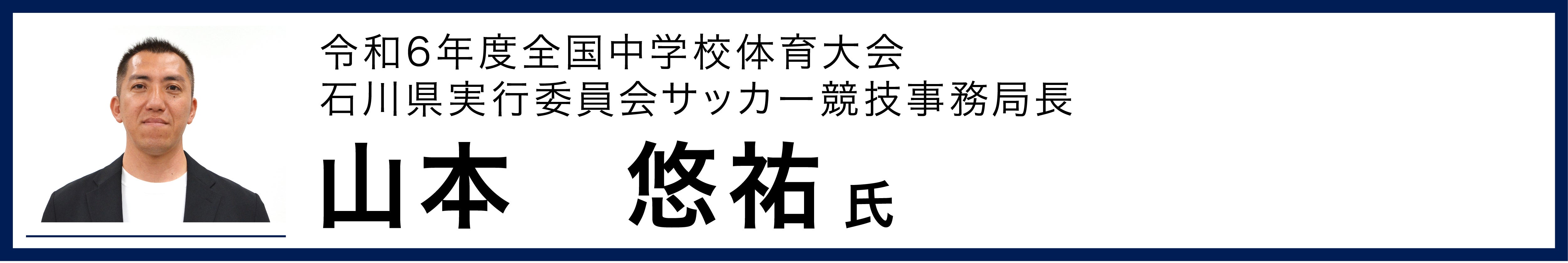 第55回全国中学校サッカー大会の事務局長の山本悠祐です。4年前から全中開催に向けて準備をしてきました。今年は能登半島地震に見舞われました。全中サッカーにも影響がありましたが、多くの方のご支援・ご協力のおかげで、全中開催へと歩みを止めることなく、今日を迎えています。