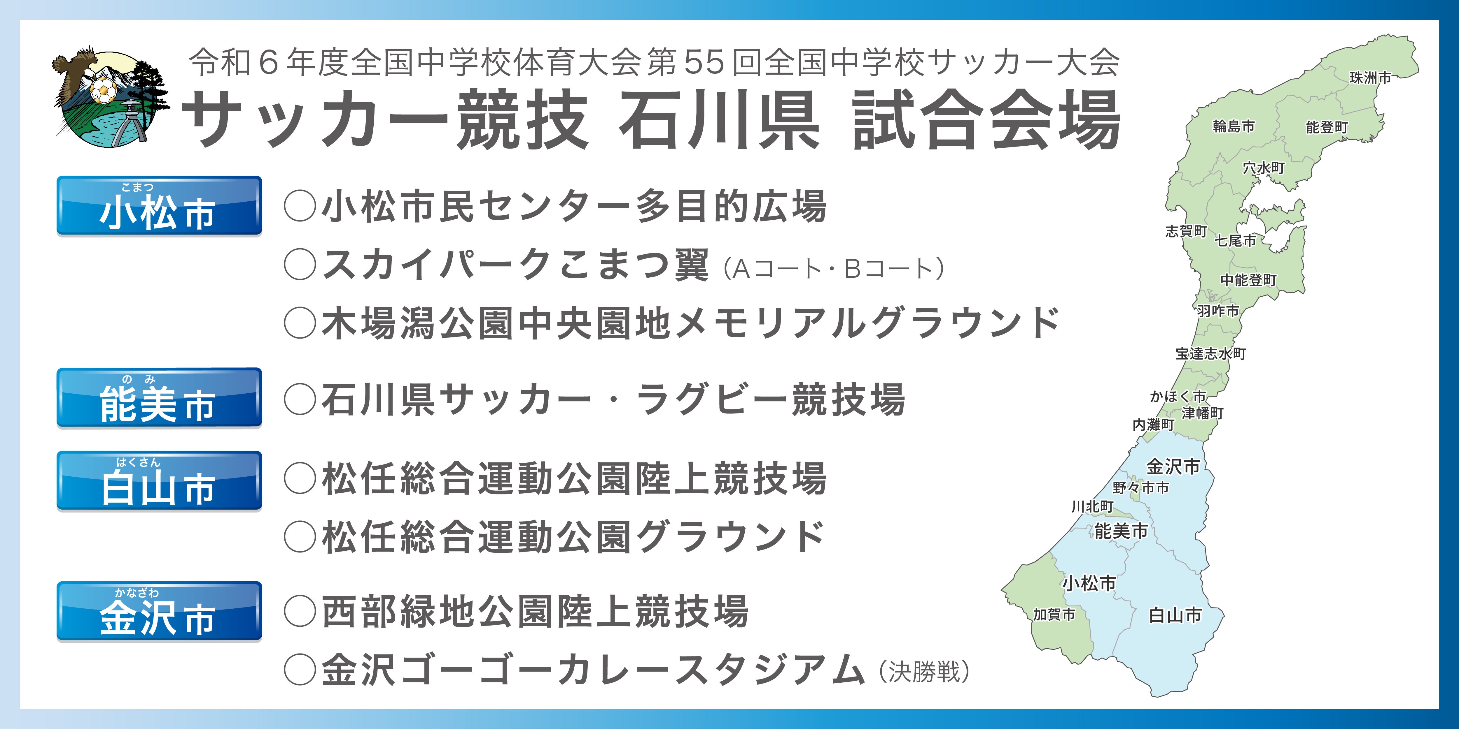 日頃より、石川県サッカー協会の活動にご理解とご支援をいただき、ありがとうございます。毎年8月に開催される、全国中学校体育大会。中学校の運動部活動、日本一を決める大会で、中学生の選手たちにとっては憧れの舞台であり、ここを目標に、日頃の練習に励んでいます。全国9ブロックで持ち回り開催しており、2024年は北信越5県がそんな特別な大会の舞台となります。