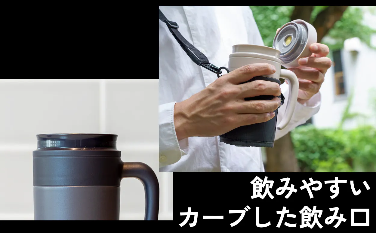 - 一般的に、飲み口の縁の部分が薄いと本来の味わいや感覚をよりストレートに感じることができると言われています。HANDLE TUMBLERでは湾曲した薄めの飲み口に仕上げることで、どんな飲料の味わいも楽しんでいただける万能デザインです。