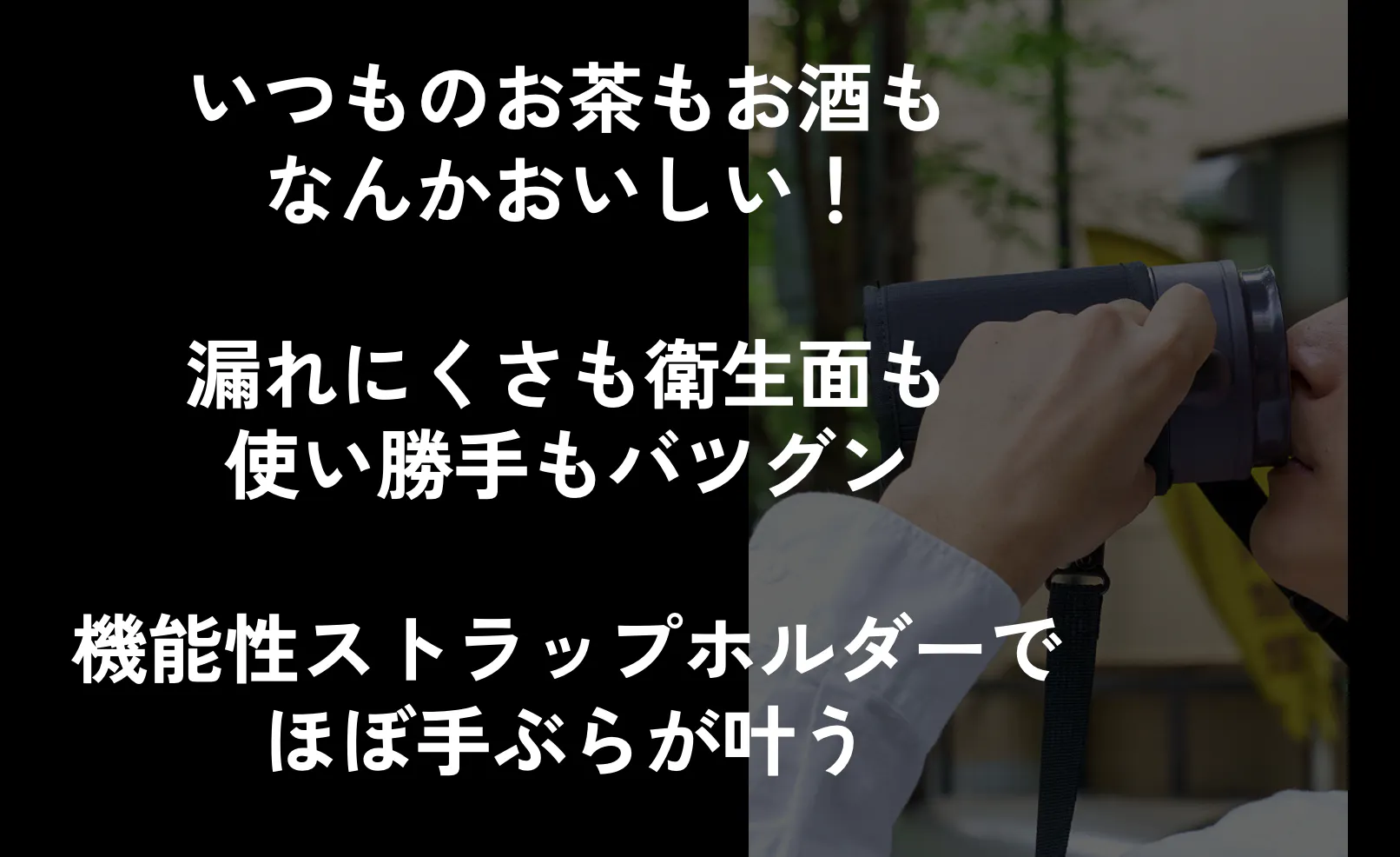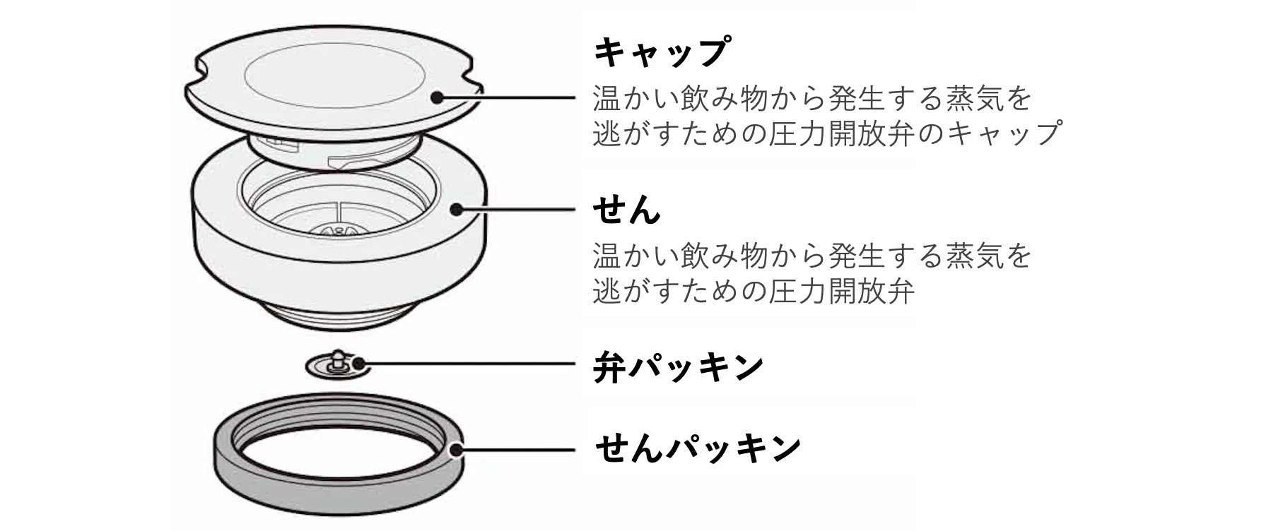 - シリコーンゴム製のパッキンと、温かい飲み物から発生する蒸気を逃がすための圧力開放弁を搭載することで、一滴の漏れも許しません。