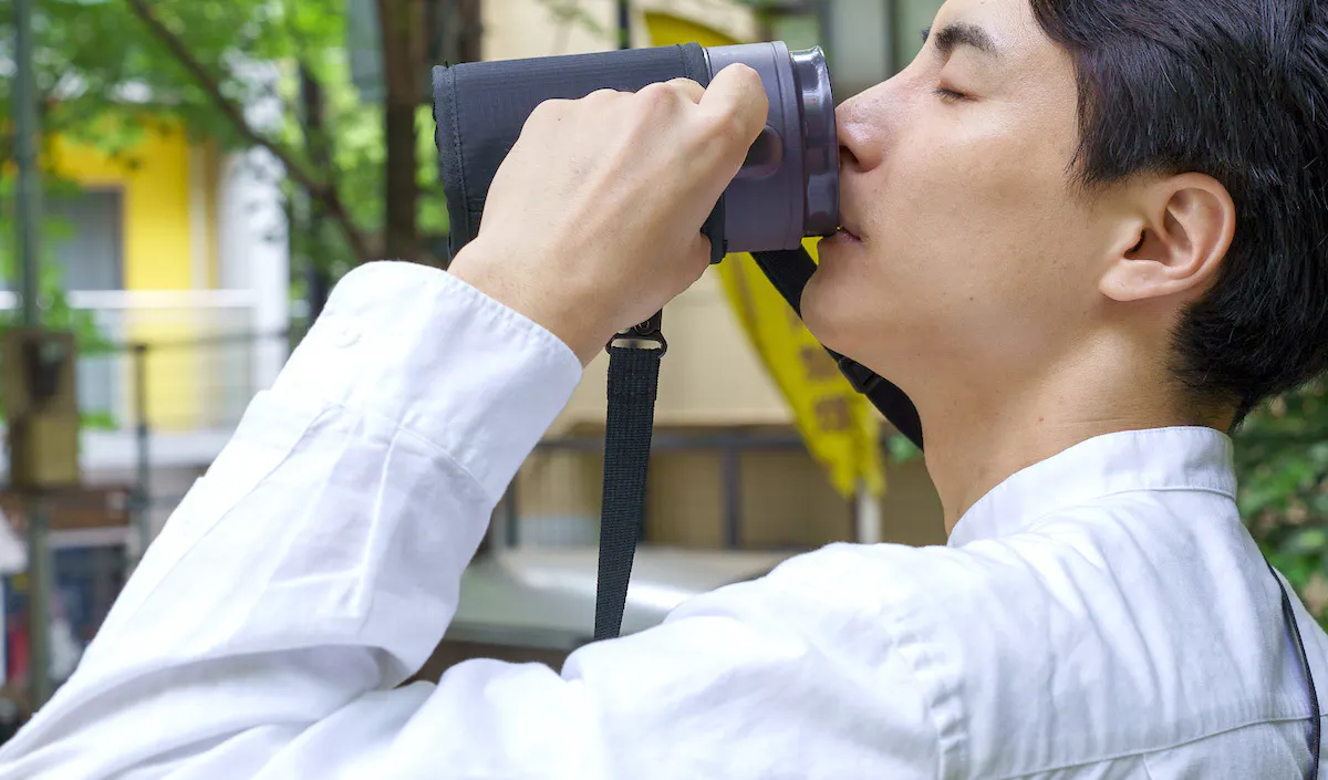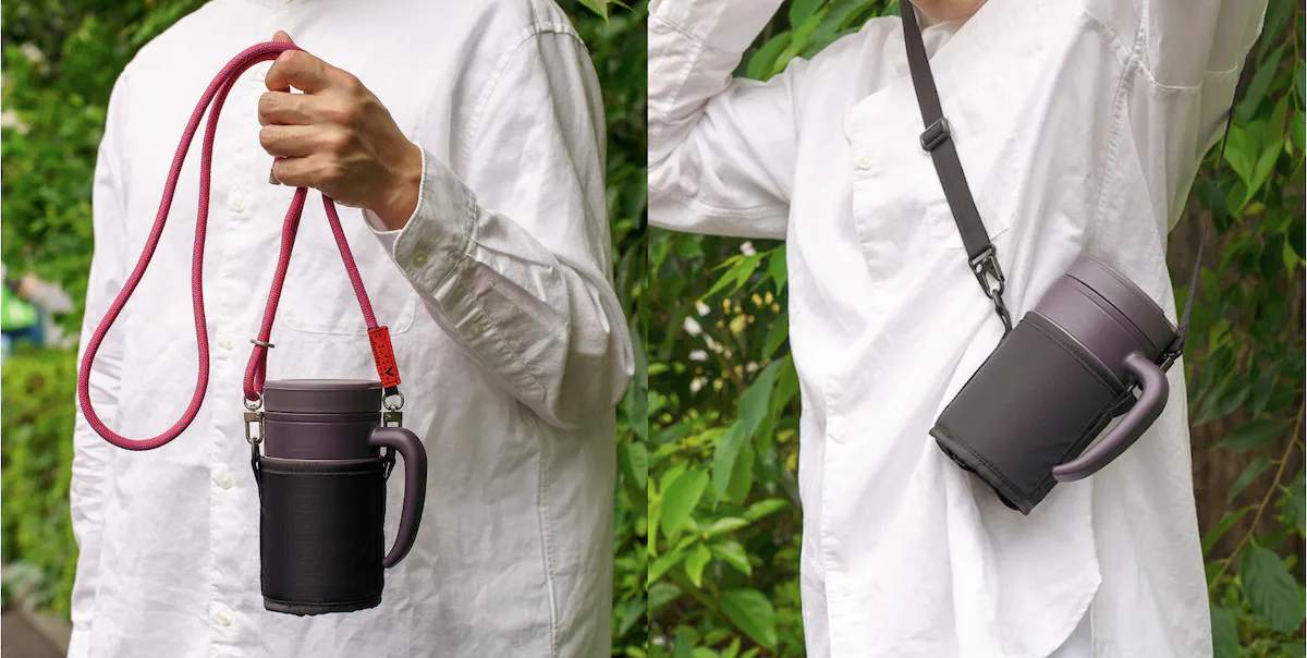 HANDLE TUMBLERには専用ストラップが付属します。表面には切り裂きに強く耐久性が高いリップストップ素材を採用。本体を衝撃から守る高い耐久性と、雨に負けない撥水性、軽さを兼ね備えた屋外でも頼れる仕様です。
