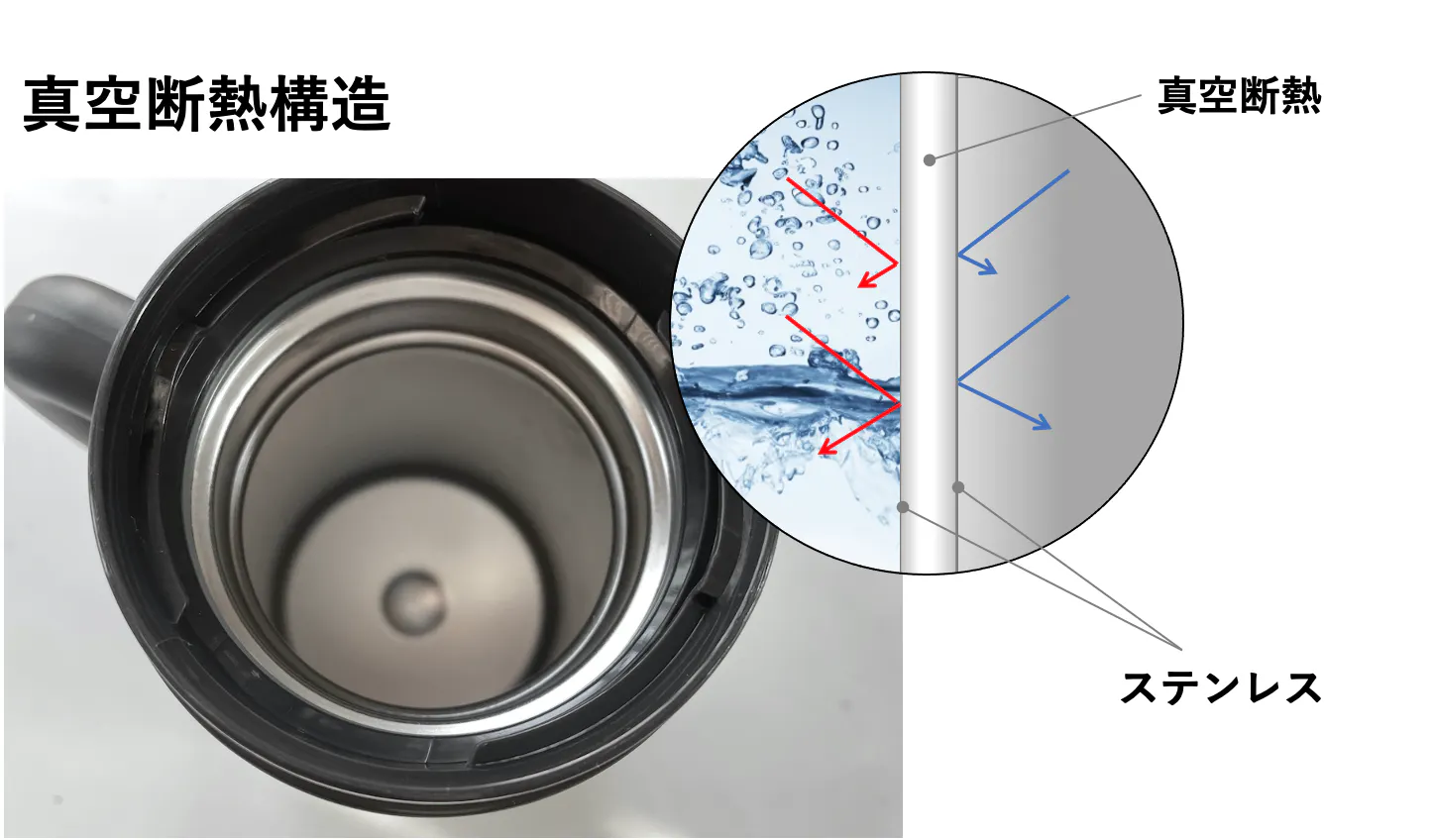 - HANDLE TUMBLERは保温、保冷力の高いステンレスの二重真空断熱構造。外びんと内びんの間を真空状態にすることで、対流による放熱を防ぎます。