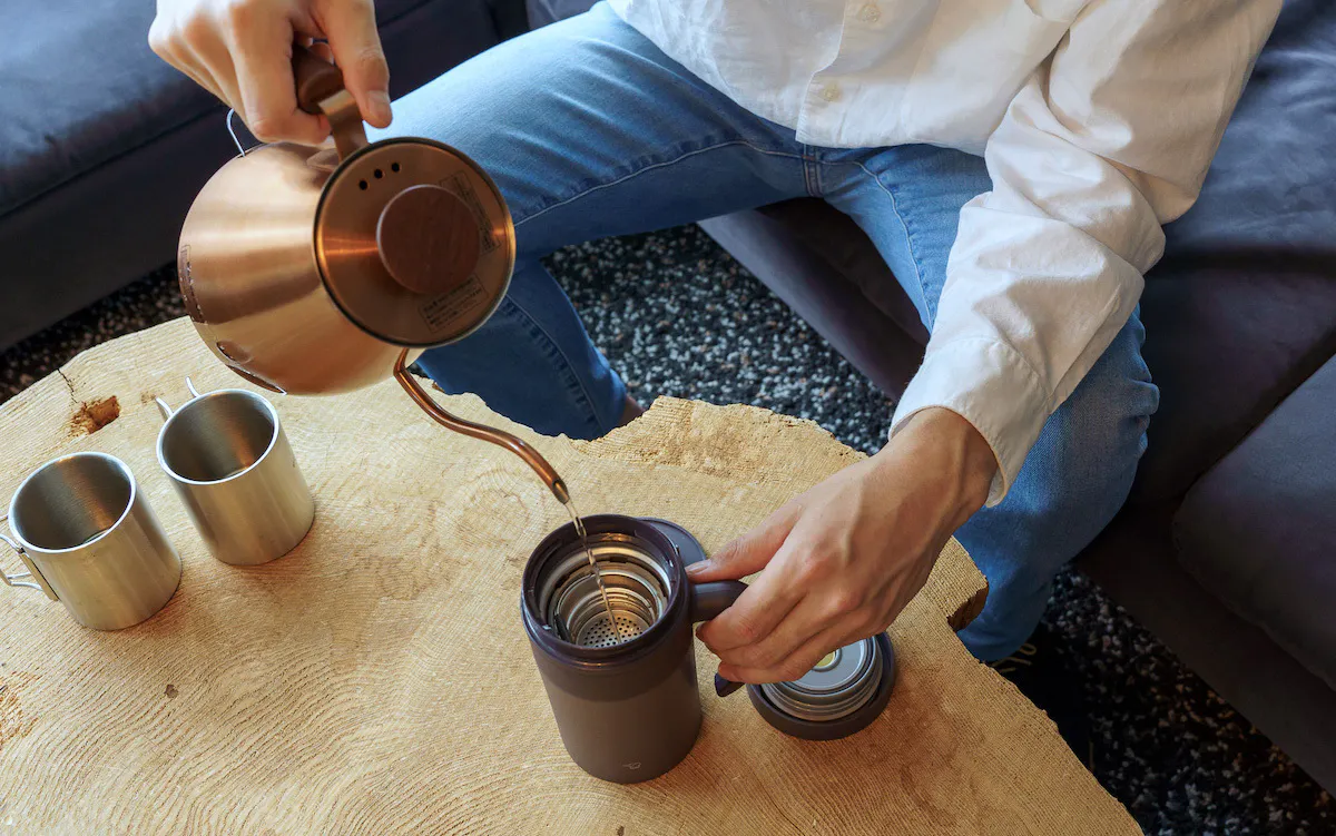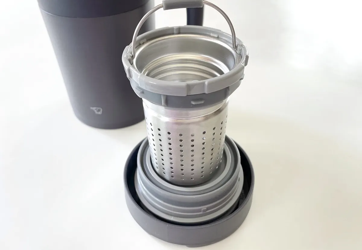適量の茶葉を茶こしに入れ、写真の茶葉ストッパーをはめれば準備完了。そのまま茶こしをタンブラーにセットして湯または水に浸せば、ホットもアイスもどちらも手軽に、本格的な味わいを楽しめます。