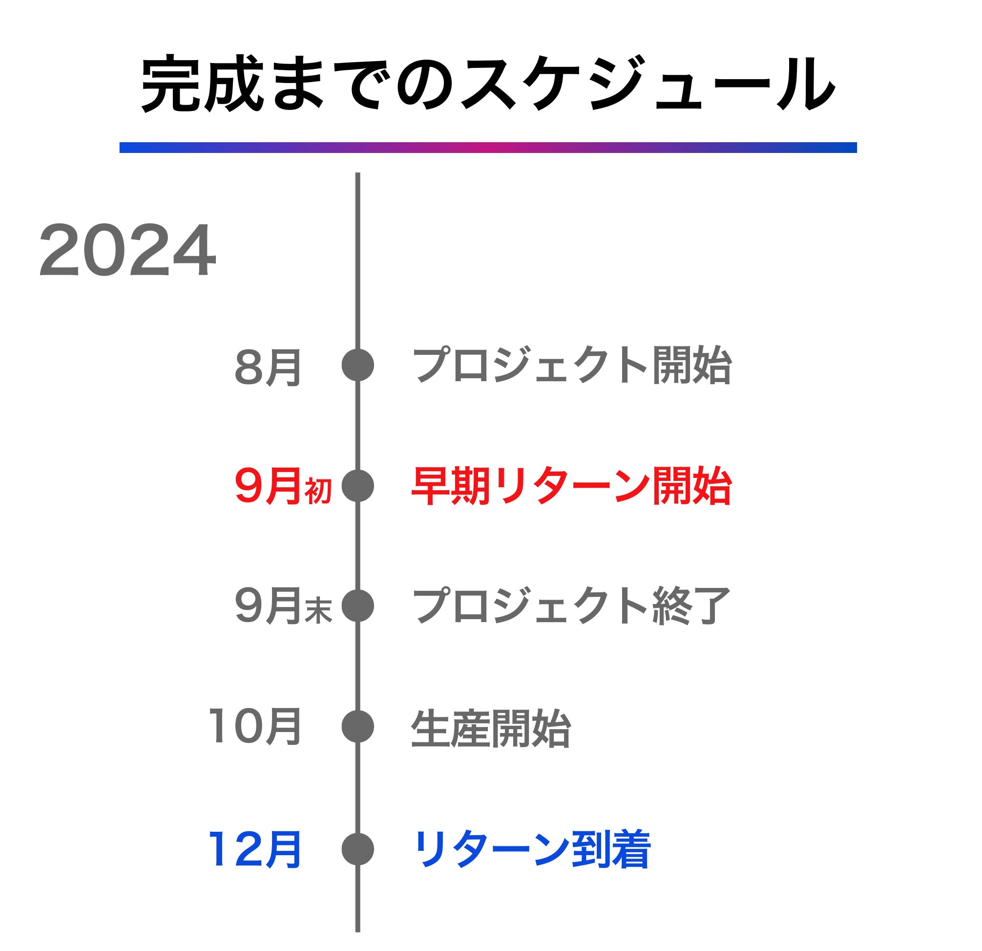 ※本文中に記載させていただいたスケジュールは、あくまでプロジェクト公開時点の予定です。クラウドファンディングの性質上、配送遅延のおそれがございます。