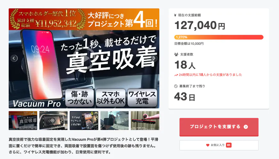 この度は「【第4弾】1秒でガッシリ自動固定!ワイヤレス充電対応の真空吸着式スマホホルダー」に支援頂き誠にありがとうございます!