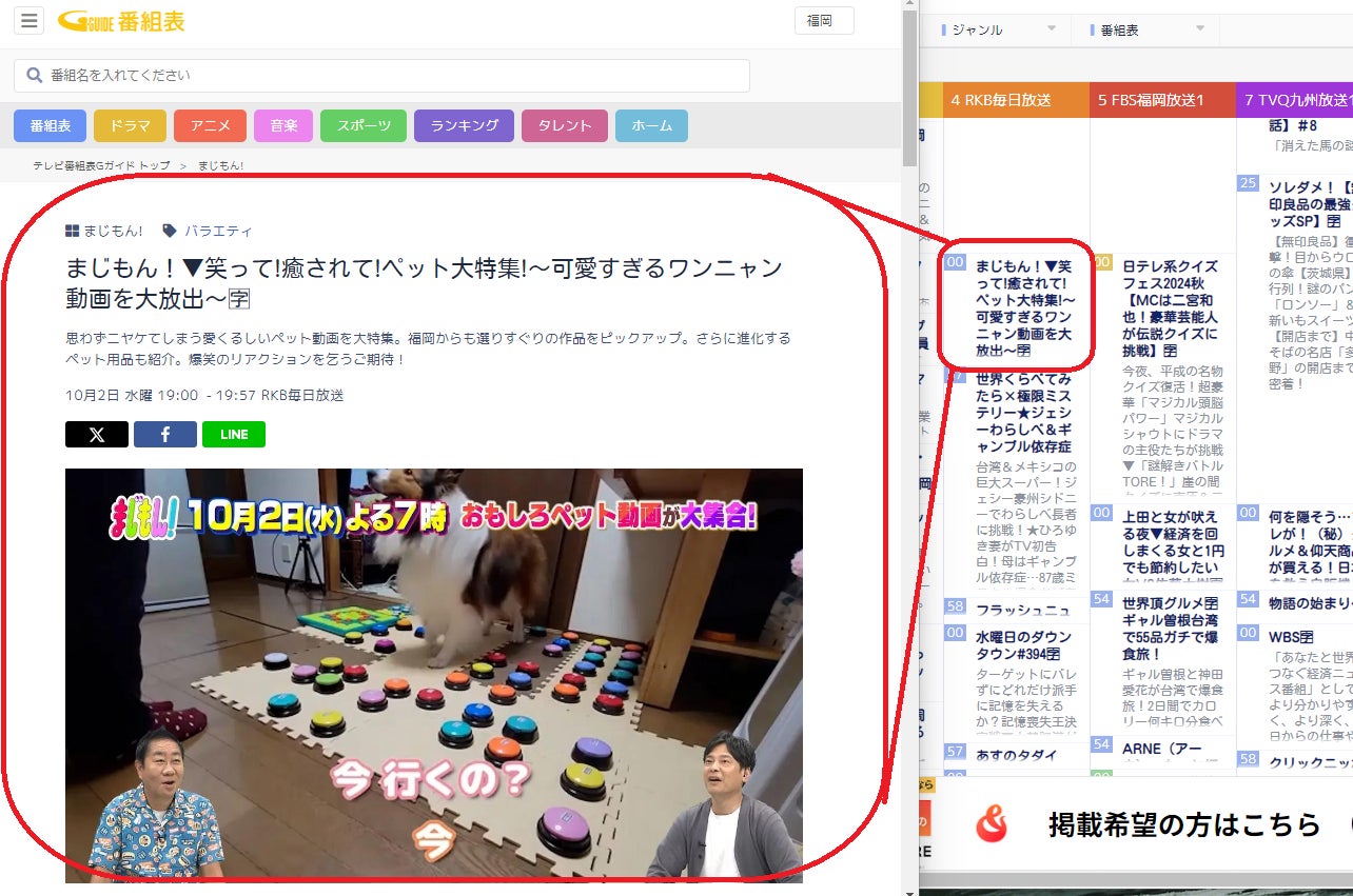 明日の九州のテレビ欄です。10月2日19時スタート出ました!ゴールデン番組「まじもん!」でブリンバンボールが特集されました!放送される地区の方は是非見てくださいね!かわいい犬猫達がブリンバンボールで遊ぶ姿が見れます(^^♪放送されない方はティーバーで見てくださいね!広報担当 猫リーマン