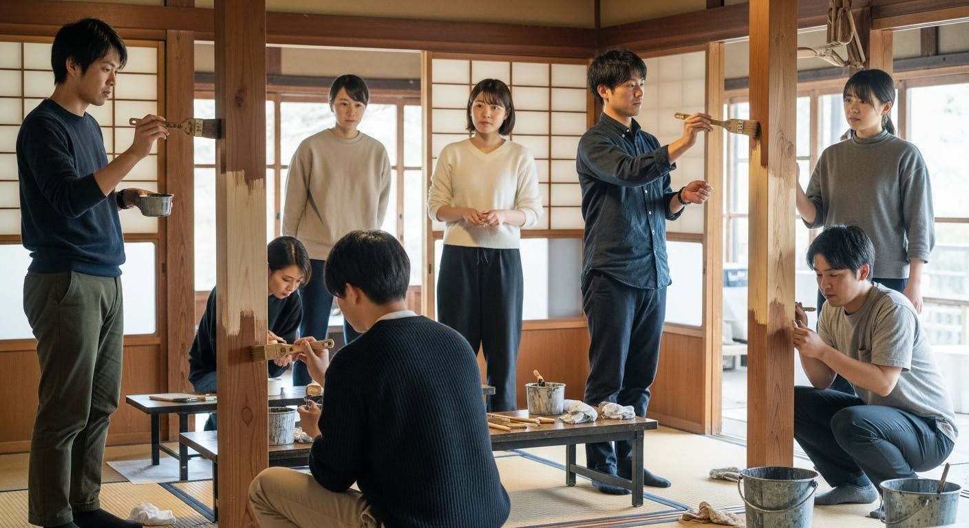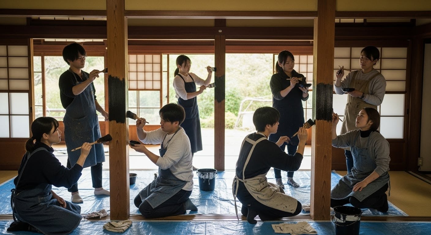 このイベントでは、昭和の雰囲気が残る元空き家の物件を、ニス塗りをして宿泊施設によみがえらせるというものです。